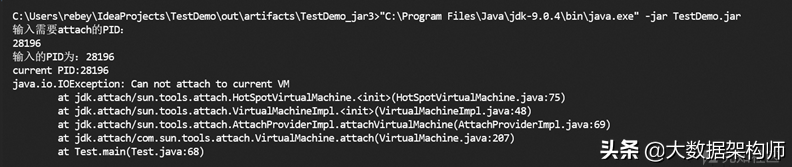 编写一个demo尝试attach自身PID,提示CannotattachtocurrentVM,如下: