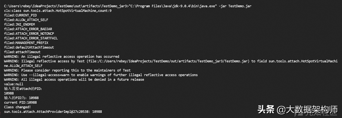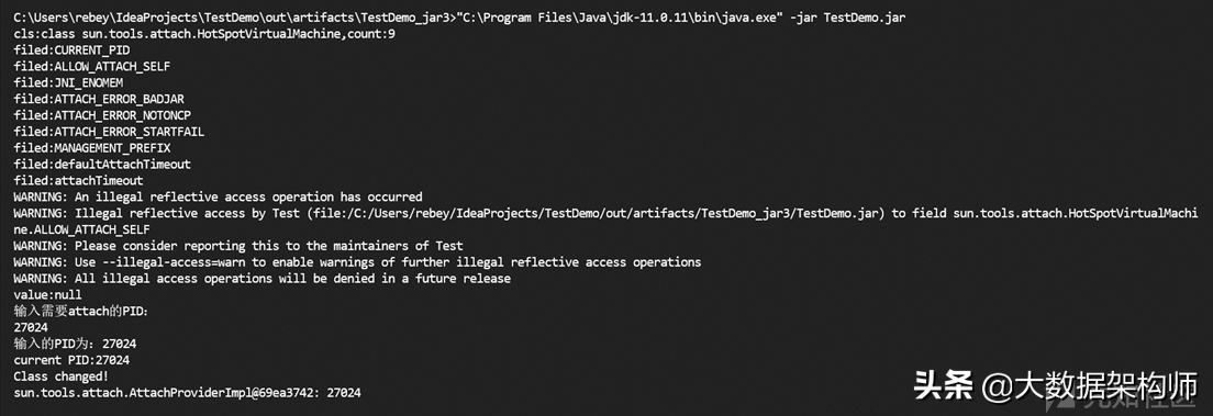 由于ALLOW_ATTACH_SELF字段有final修饰符,所以在修改ALLOW_ATTACH_SELF值的同时,也需要把它的final修饰符给去掉(修改的时候,会有告警产提示,不影响最终效果,可以忽略)。修改后,可以成功attach到自身进程,如下图: