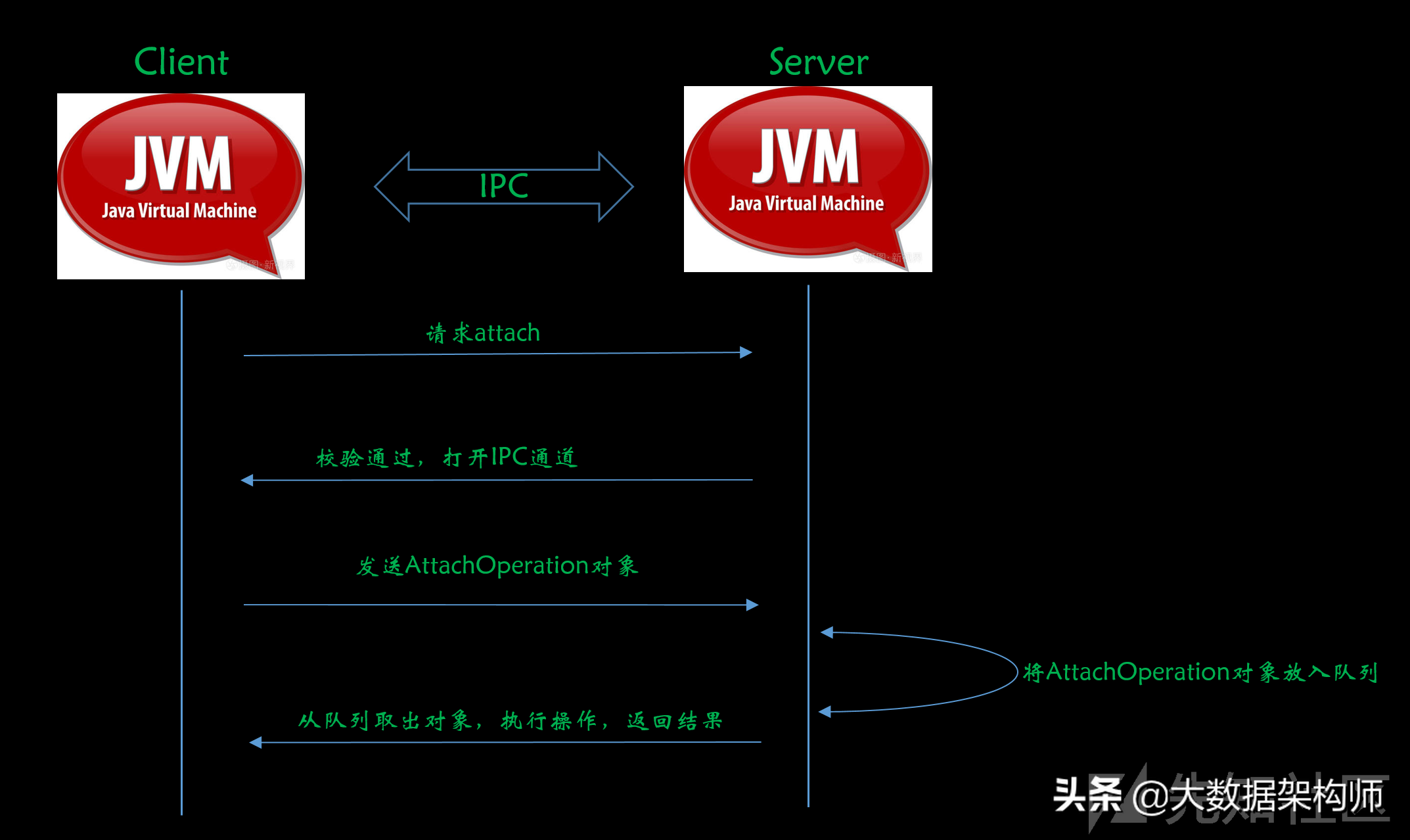 JVM收到请求后,做一些校验(比如上文提到的的校验),校验通过后,会打开一个IPC通道。