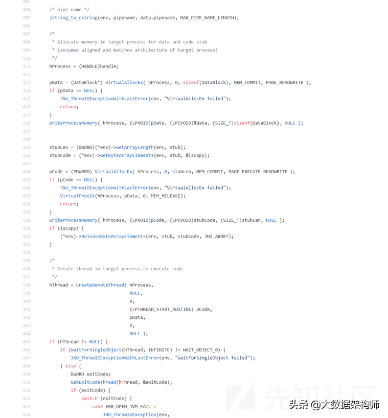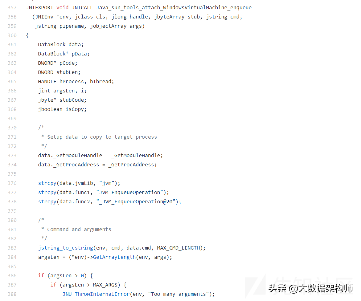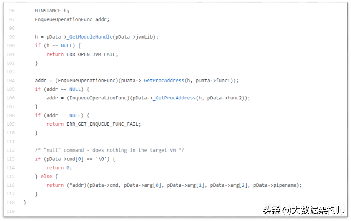 这段代码是把Client发过来的对象进行解包,然后解析里面的指令。经常写Windowsshellcode的人应该会看到两个特别熟悉的API:GetModuleHandle、GetProcAddress,这是动态定位DLL中导出函数的常用API。这里的操作就是动态从中动态定位名称为JVM_EnqueueOperation和_JVM_EnqueueOperation@20的两个导出函数,这两个函数就是上文流程图中将AttachOperation对象放入队列的执行函数。