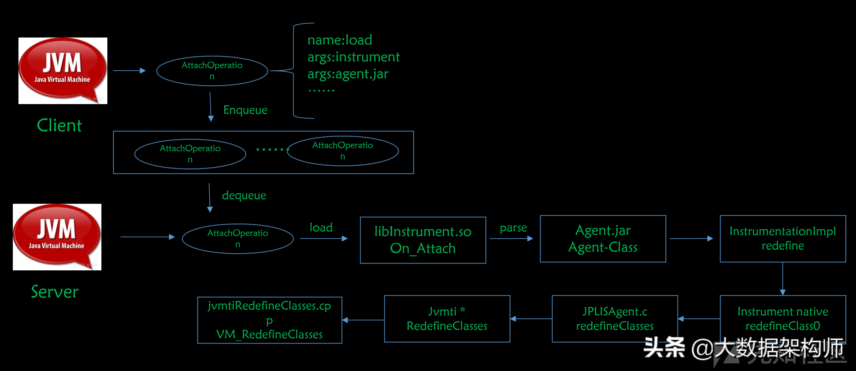 服务端解析AttachOperation,提取步骤1中提到的3个参数,调用actionName为load的对应处理分支,然后加载(在windows平台为),执行AttachOperation的On_Attach函数(由此可以看到,Java层的instrument机制,底层都是通过Native层的Instrument来封装的);