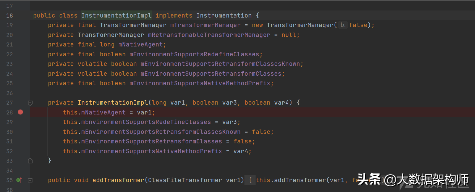 执行流转到Java层,JVM会实例化一个InstrumentationImpl类,这个类在构造的时候,有个非常重要的参数mNativeAgent: