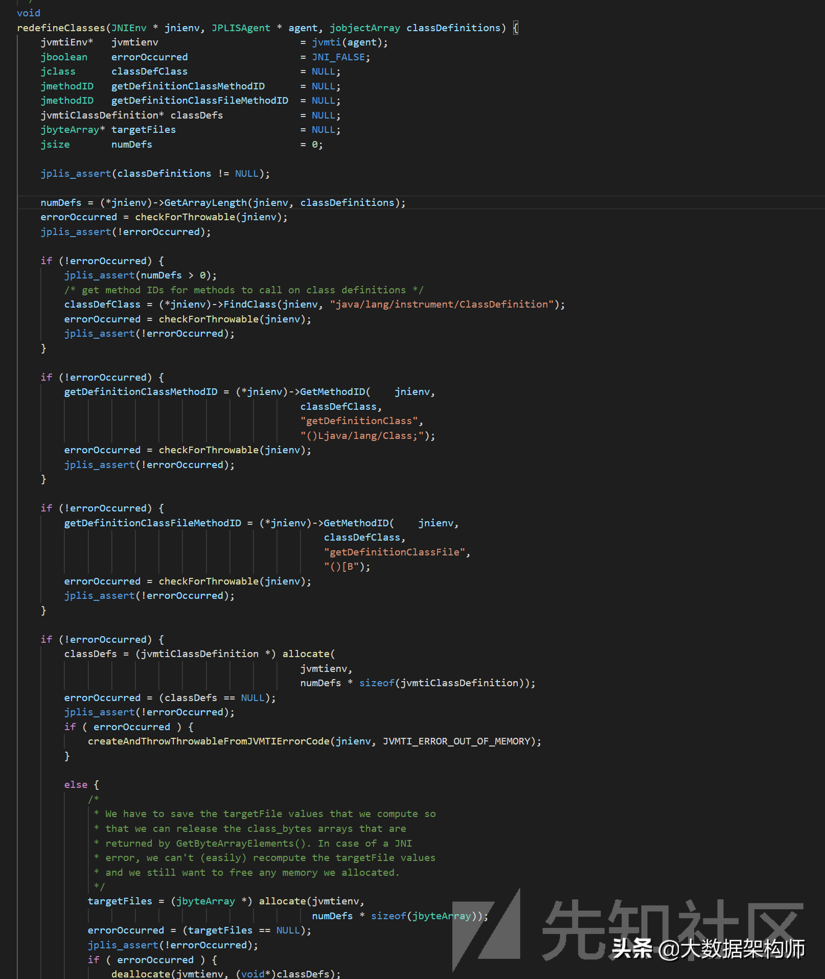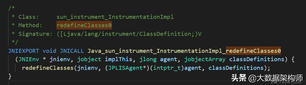 上一小节我们在伪造JPLISAgent对象的时候,留意到redefineClasses函数里面有这种代码: