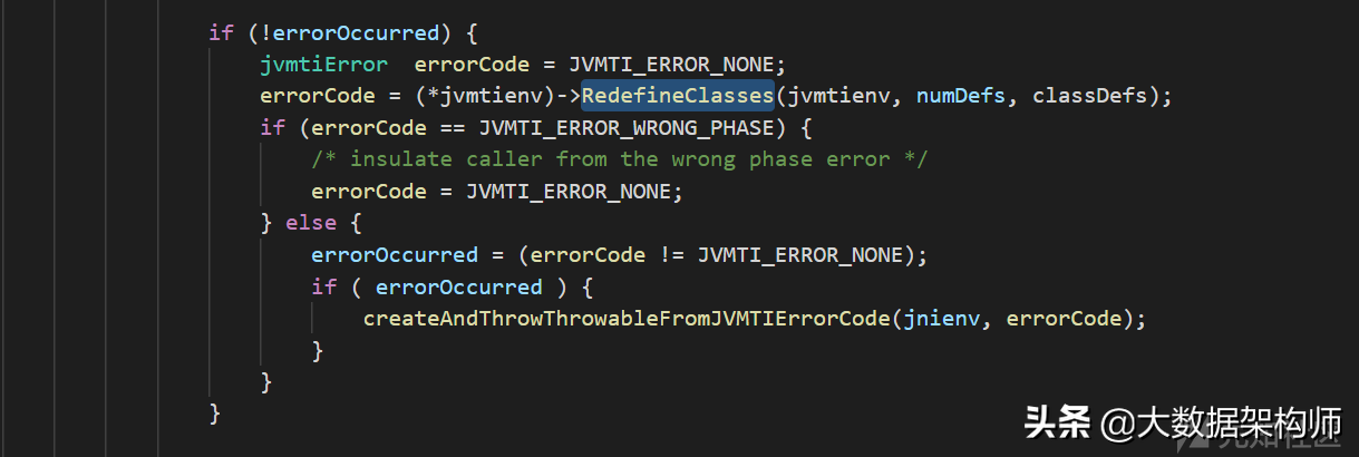 做了一系列判断之后,最终调用jvmtienv的redefineClasses方法执行类redefine操作: