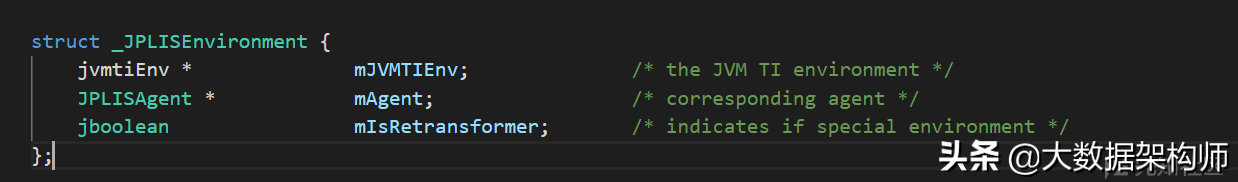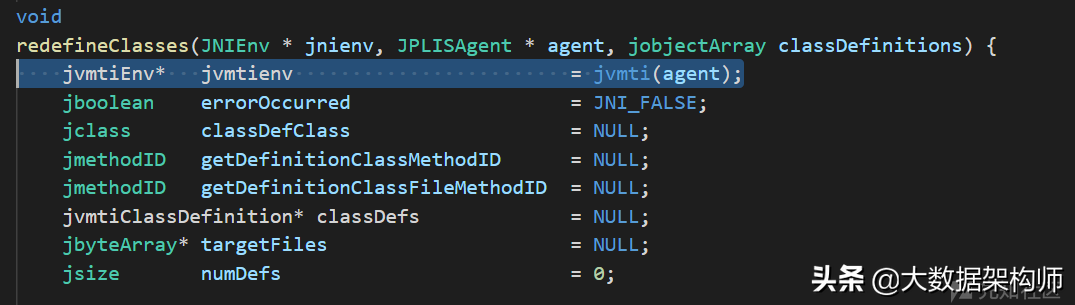 JPLISAgent是一个复杂的数据结构。由上文中redefineClasses代码可知,最终实现redefineClasses操作的是*jvmtienv的redefineClasses函数。但是这个jvmtienv的指针,是通过jvmti(JPLISAgent)推导出来的,如下: