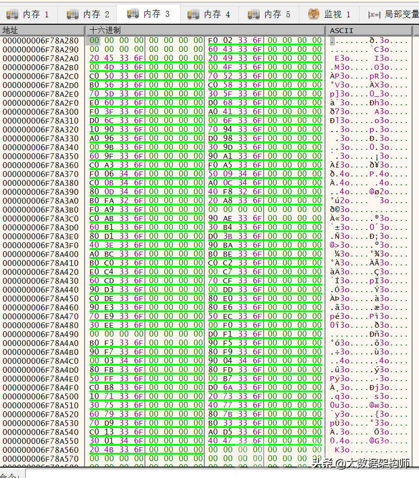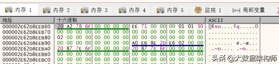 可见前后有很多指针,绿色的那些指针,都指向jvm的地址空间: