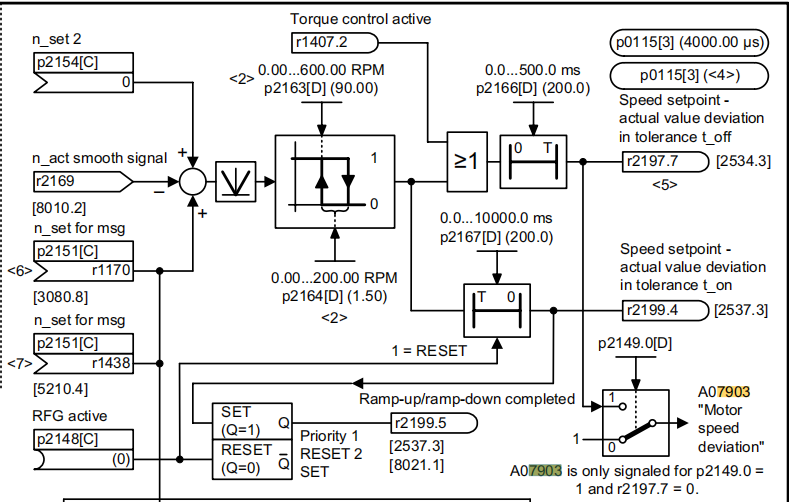 故障原因:两个设定值(p2151,p2154)和转速实际值(r2169)的转速差值超过了容差阈值(p2163),大于容差(p2164,p2166)。只有当=1时,警告才释放。