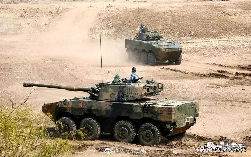中国对标的11式轮式突击炮(近)和08式轮式步战(远)也已经大量装备