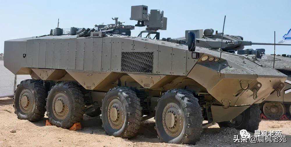 以色列在少量装备“纳梅尔”重步战的同时,需要大批更换M113装甲车,也研制了“埃坦”。这也是30-35吨的重轮战,基本型以运兵为主,只有机枪火力,但全向防护达到14.5毫米重机枪弹以上,防爆能力达到10公斤TNT当量,还装备有轻量版“铁拳”主动防御系统。这可能是防御能力最强悍的轮战了。