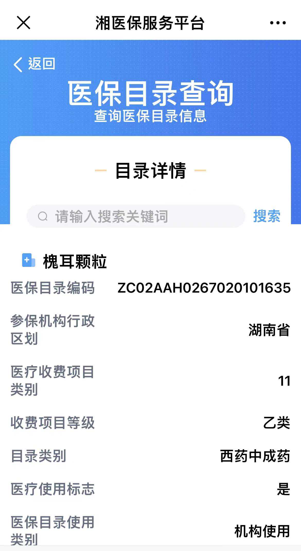 陈先生的儿子为其在网上购买槐耳颗粒服用,已经持续了2个多月。湘医保服务平台药品目录显示,槐耳颗粒的医疗收费项目类别为11,收费项目等级为乙类,属于西药中成药,医保目录使用类别为“机构使用”。