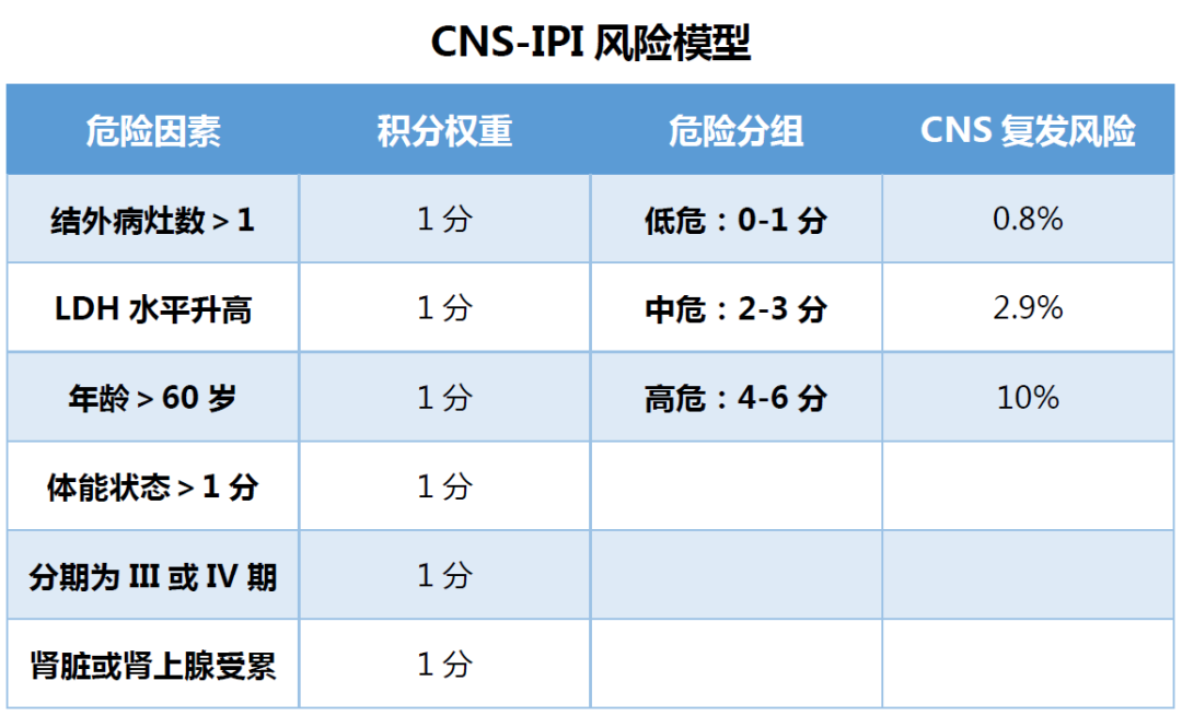 2016年Schmitz等人[9]开发了CNS国际预后指数(CNS-IPI)风险模型(详见下表),目前该模型已被NCCN指南[10]推荐用于预测DLBCL患者CNS复发风险。