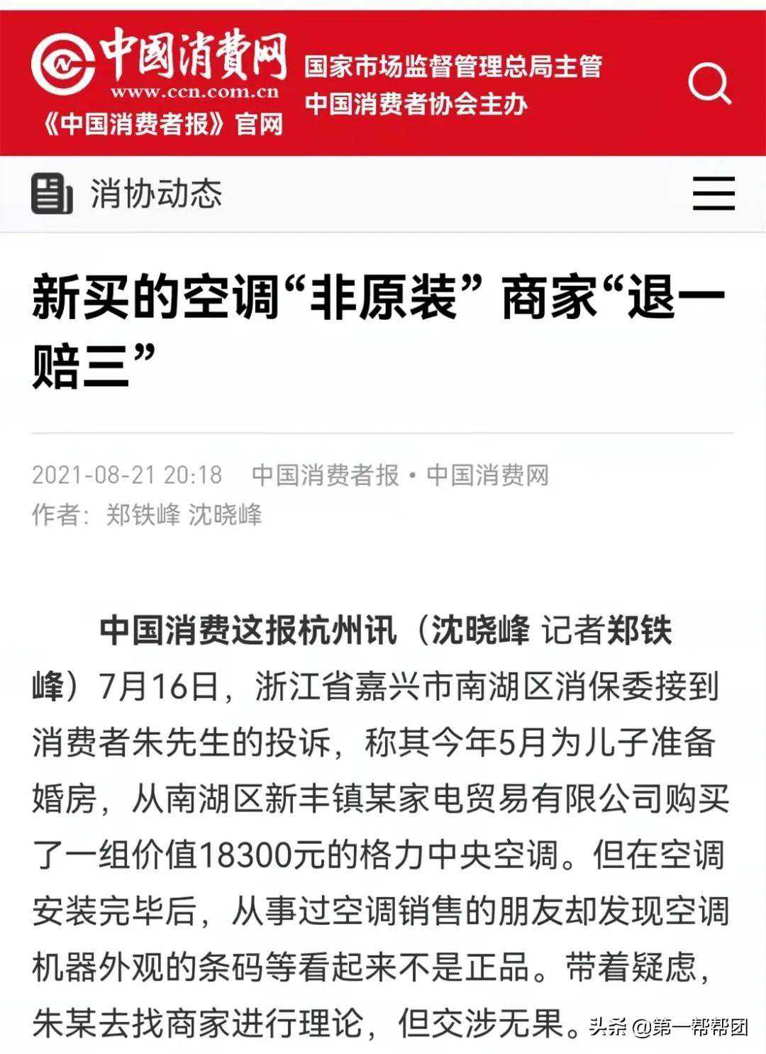中国消费报就曾报道浙江有位朱先生,在得到格力技术人员出具的鉴定产品非原装正品后,获得了“退一赔三”的赔偿。