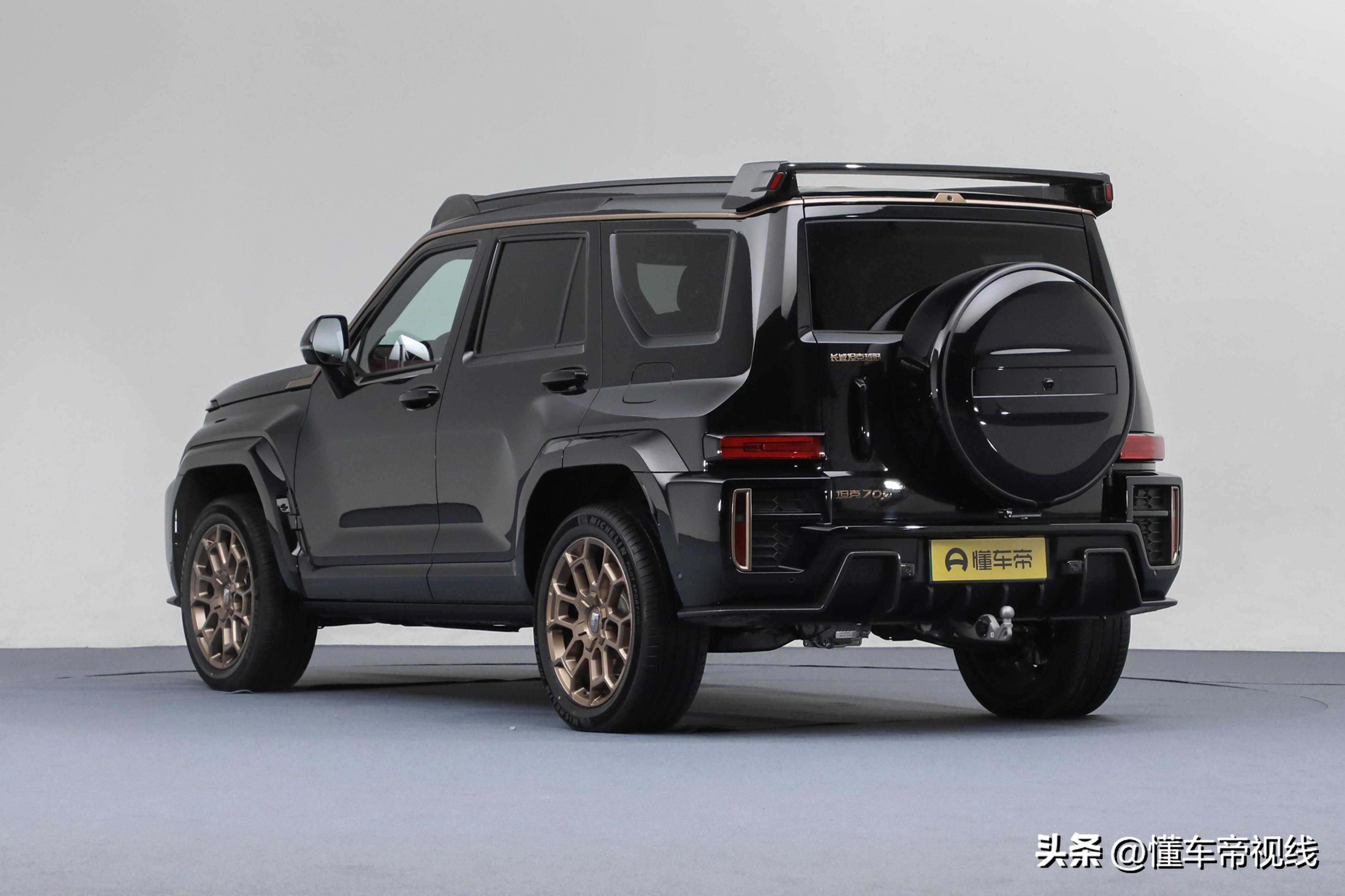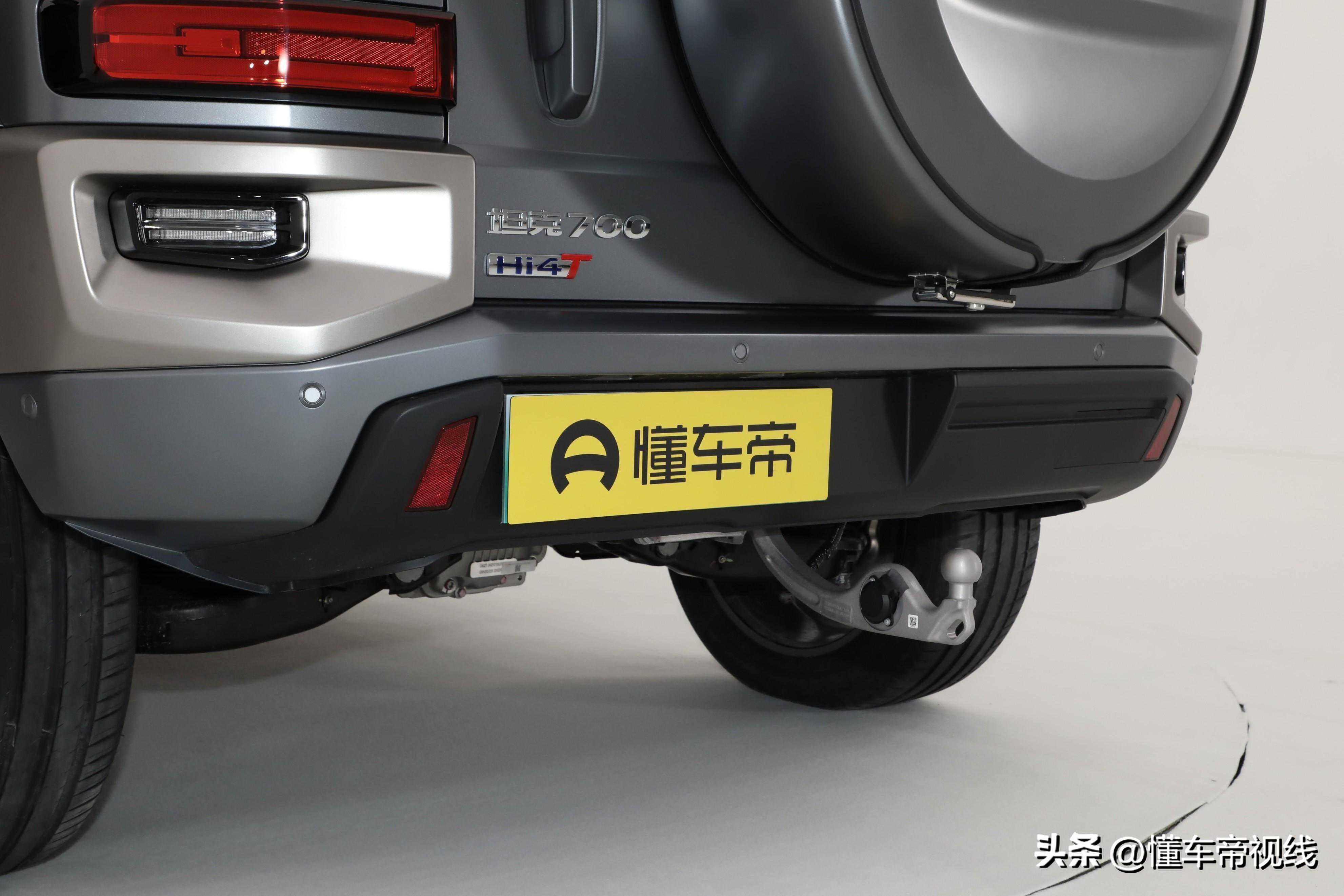坦克700Hi4-T极致版和极境版车尾配备外挂式备胎,并会配备标配电动侧踏、电吸后尾门、前风挡迎宾灯等配置,还提供前绞盘、后电动拖车钩、拖车取电口选装,也预留了原厂竞技杠改装空间,也避免了后期第三方加装竞技杠切割保险杠的麻烦。