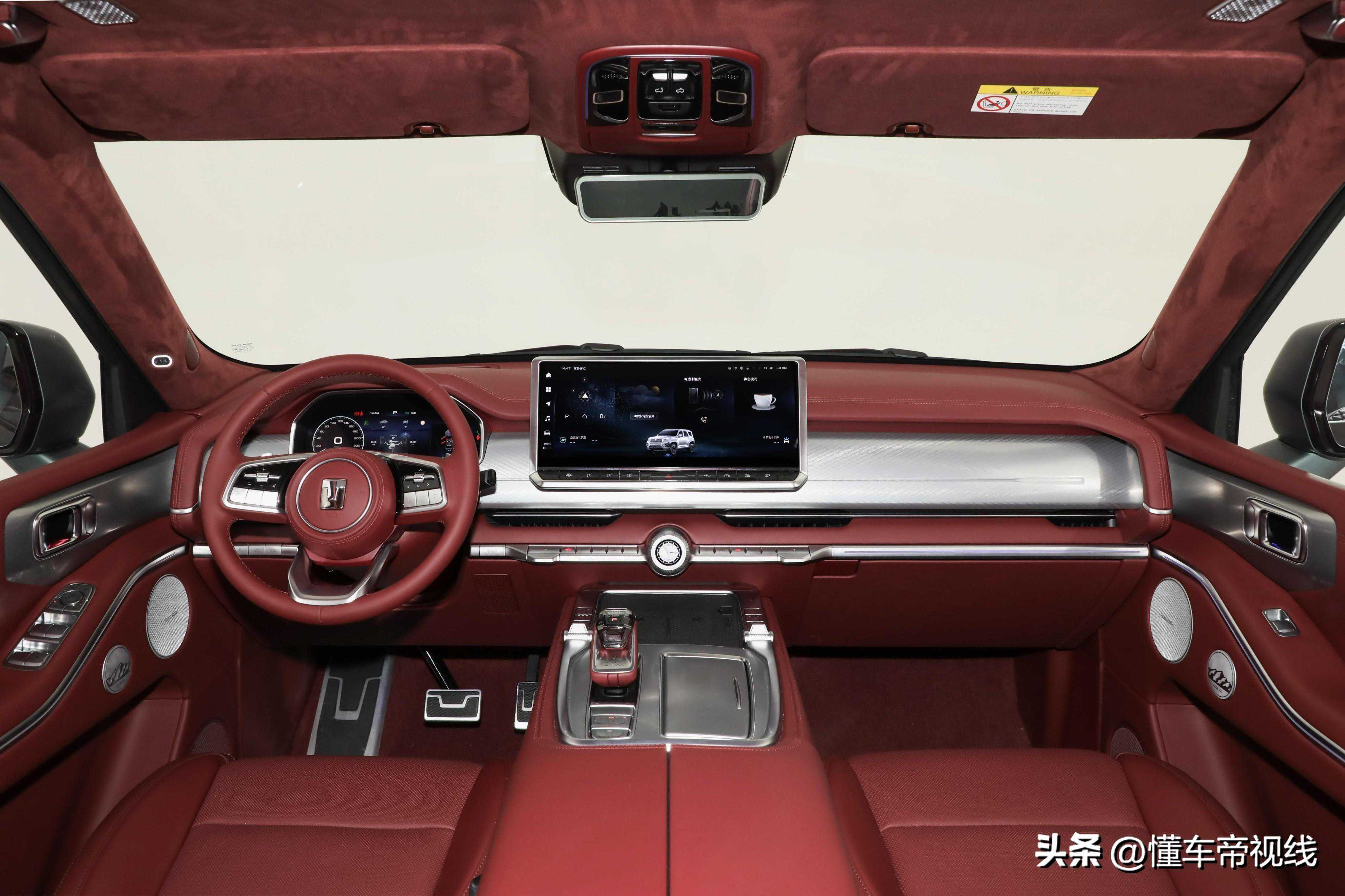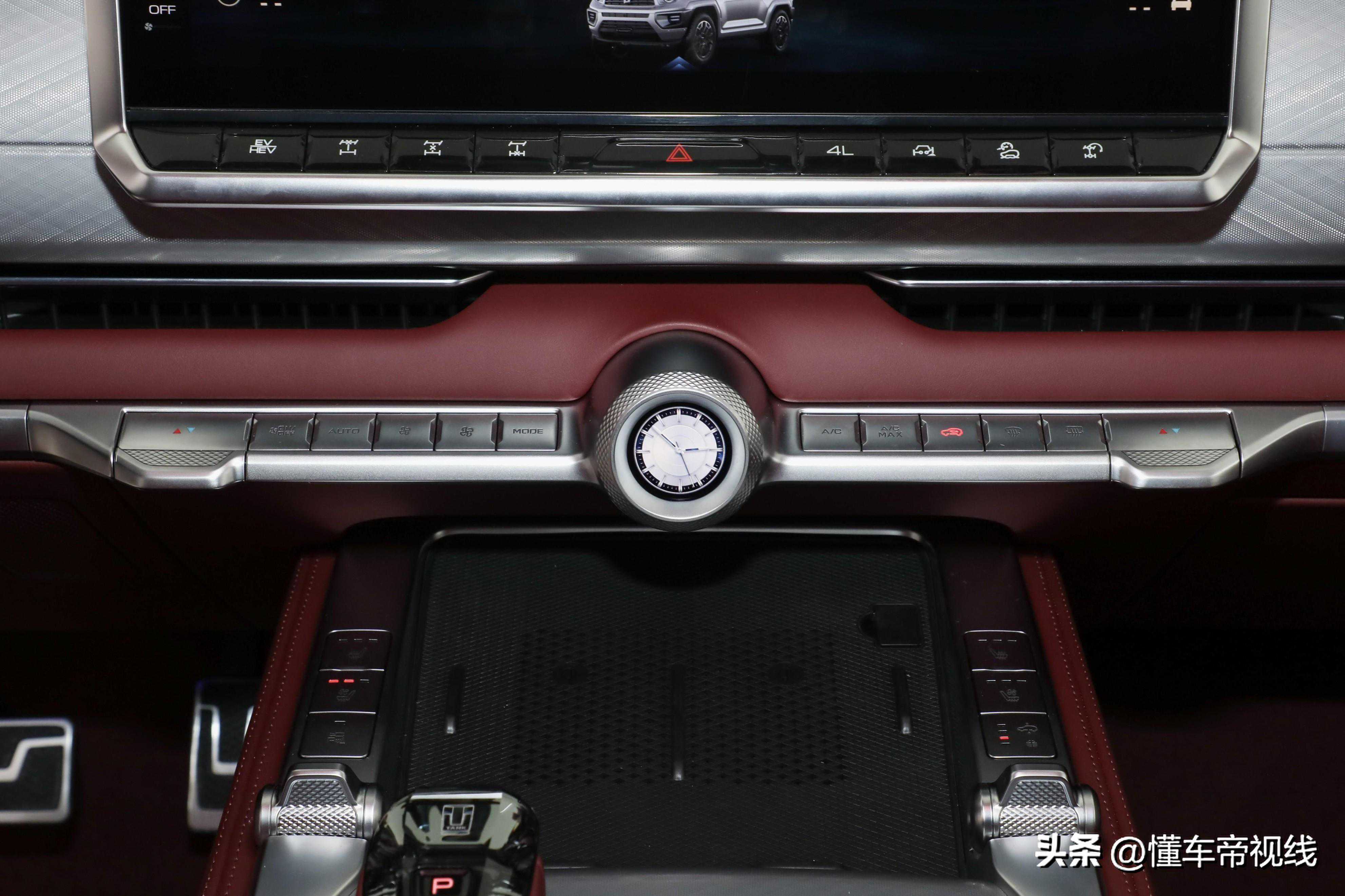 坦克700Hi4-T车内呈现出较强的豪华感,顶篷和腰线以上立柱采用了翻毛皮材质,而中控台和副仪表台则配备了银色铝制饰板。车内配备了悬浮式中控大屏和全液晶仪表盘,中控屏下方还配备了两排实体按键,上层按键主要用来调整动力以及差速锁,下层按键则用来控制空调,并且在空调按键当中还配备了一块液晶触控时钟。