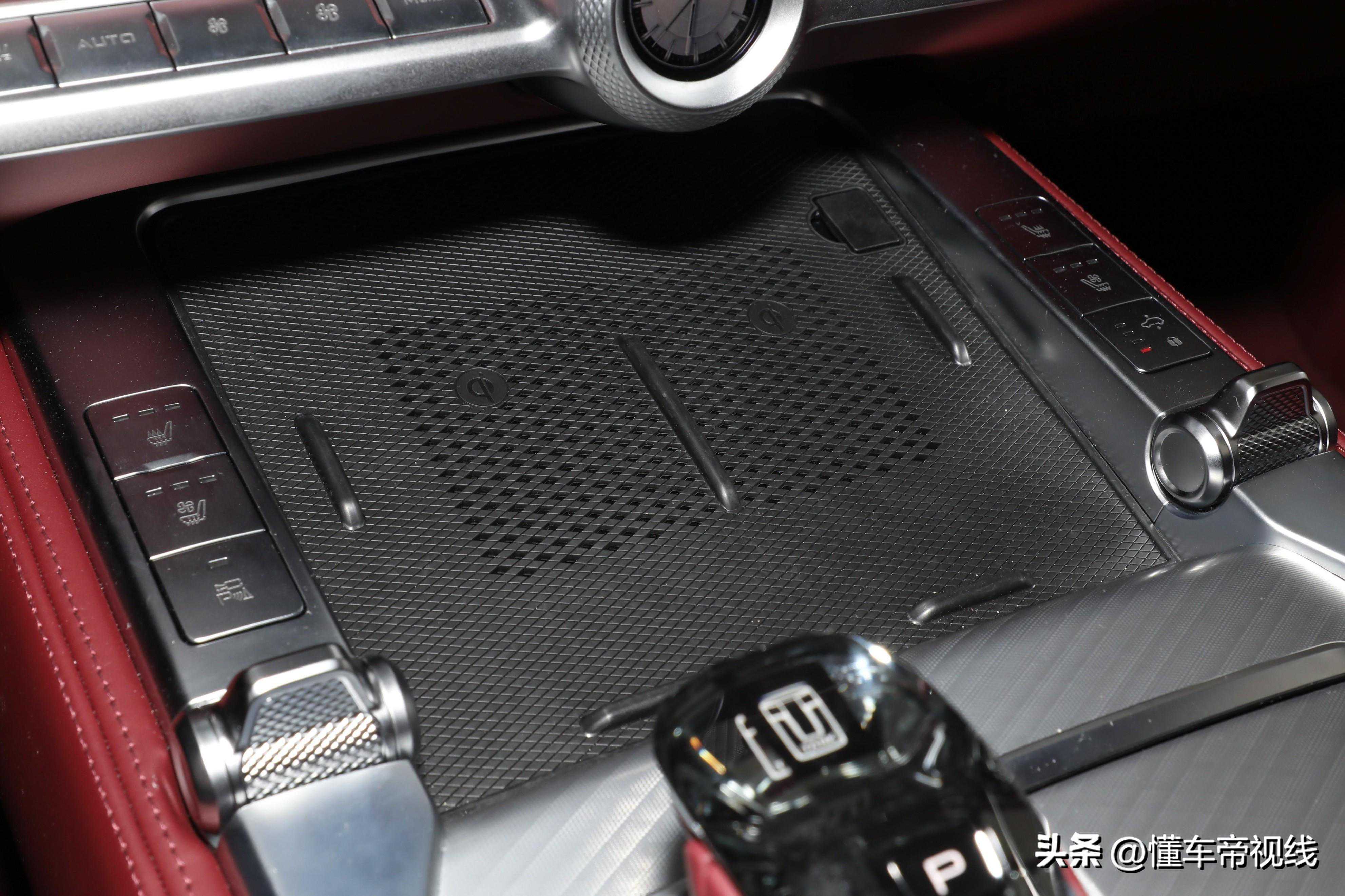 副仪表台区域前方为2个最大功率50瓦的手机无线充电面板,两侧除了控制座椅通风、加热的实体按键外,还配备了两个拨杆,左侧用来切换驾驶模式,右侧则是调整空气悬架高度。极境版和极致版带有可开启电动天窗,而首发限定版则配备了星空顶。