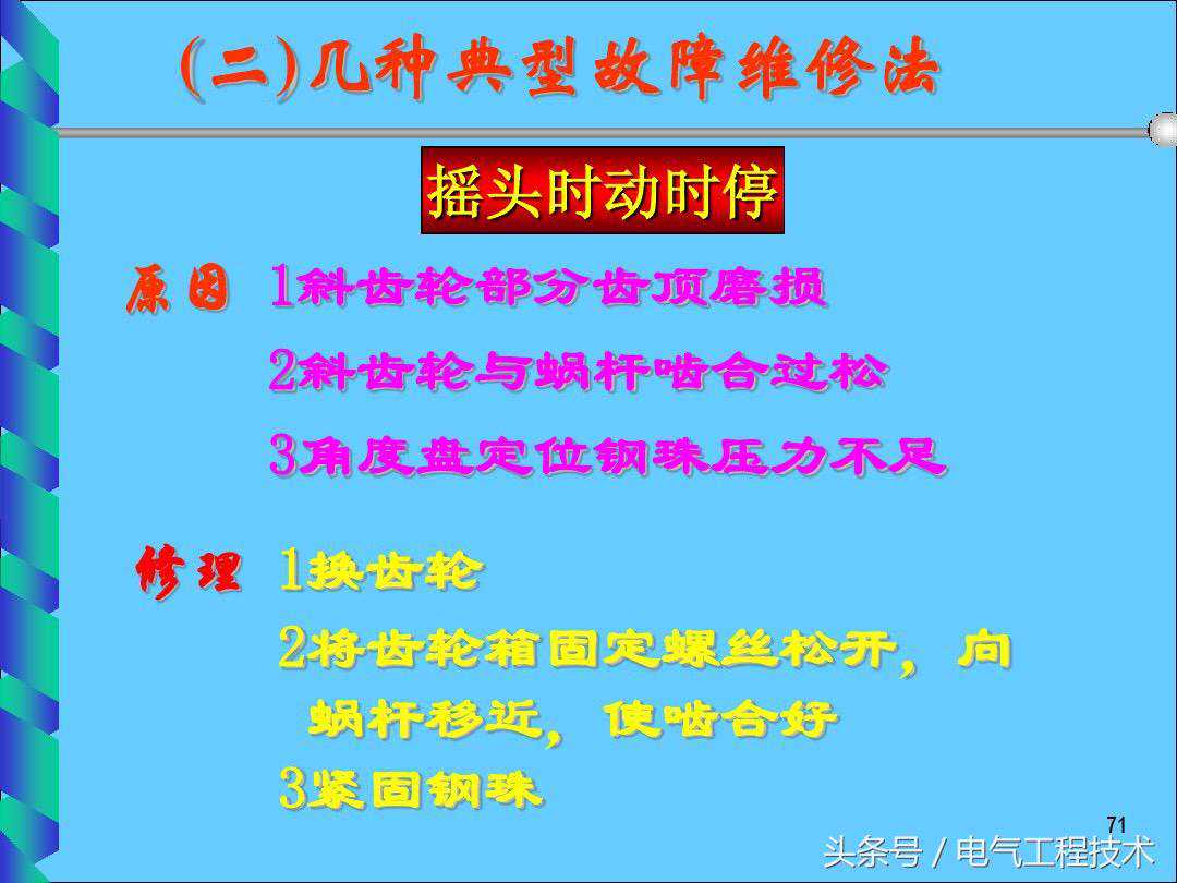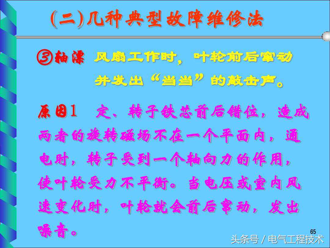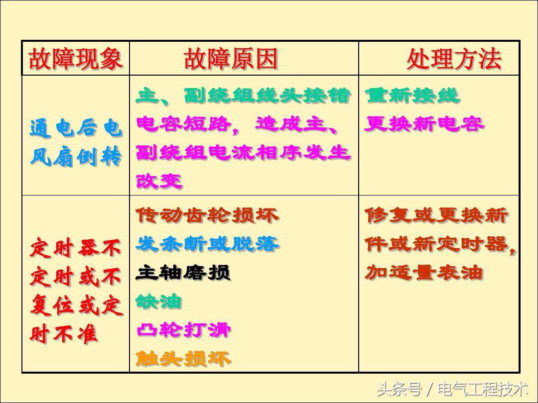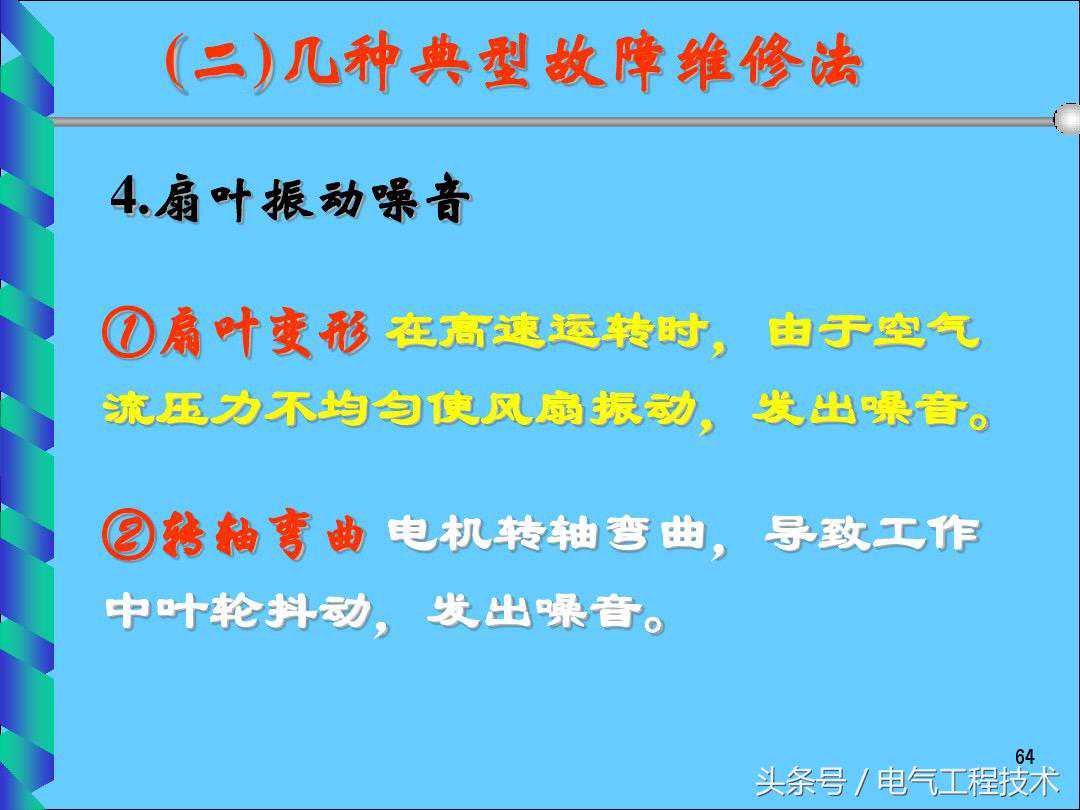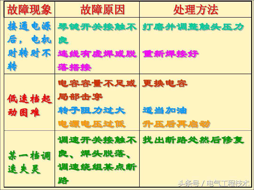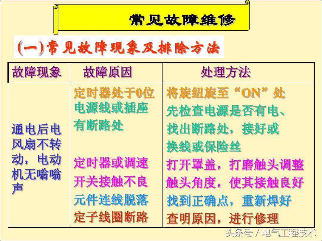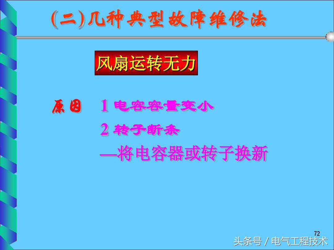 电风扇是大家都非常熟悉的电器,大部分的家庭都会使用到,对于电风扇的电路,相对比较简单,一般情况下,电风扇出问题故障了,一般的电工师傅都可以搞定,这是电工基础的技能,但是对于刚入门学习电工的师傅就不同了,虽然简单,但是因为没有相应的理论知识和动手实践经验,所以在电路故障的排查过程中自然也会比较慢,其实电工师傅们都知道,电风扇本身的故障就没那么多,高频发的故障也就那么几个,如果有电工师傅总结好了,就可以直接拿来维修使用了,今天我们就重点来看一下电工师傅总结好的25个电风扇常见的故障排查以及解决方法,希望可以对于电工初学者有帮助: