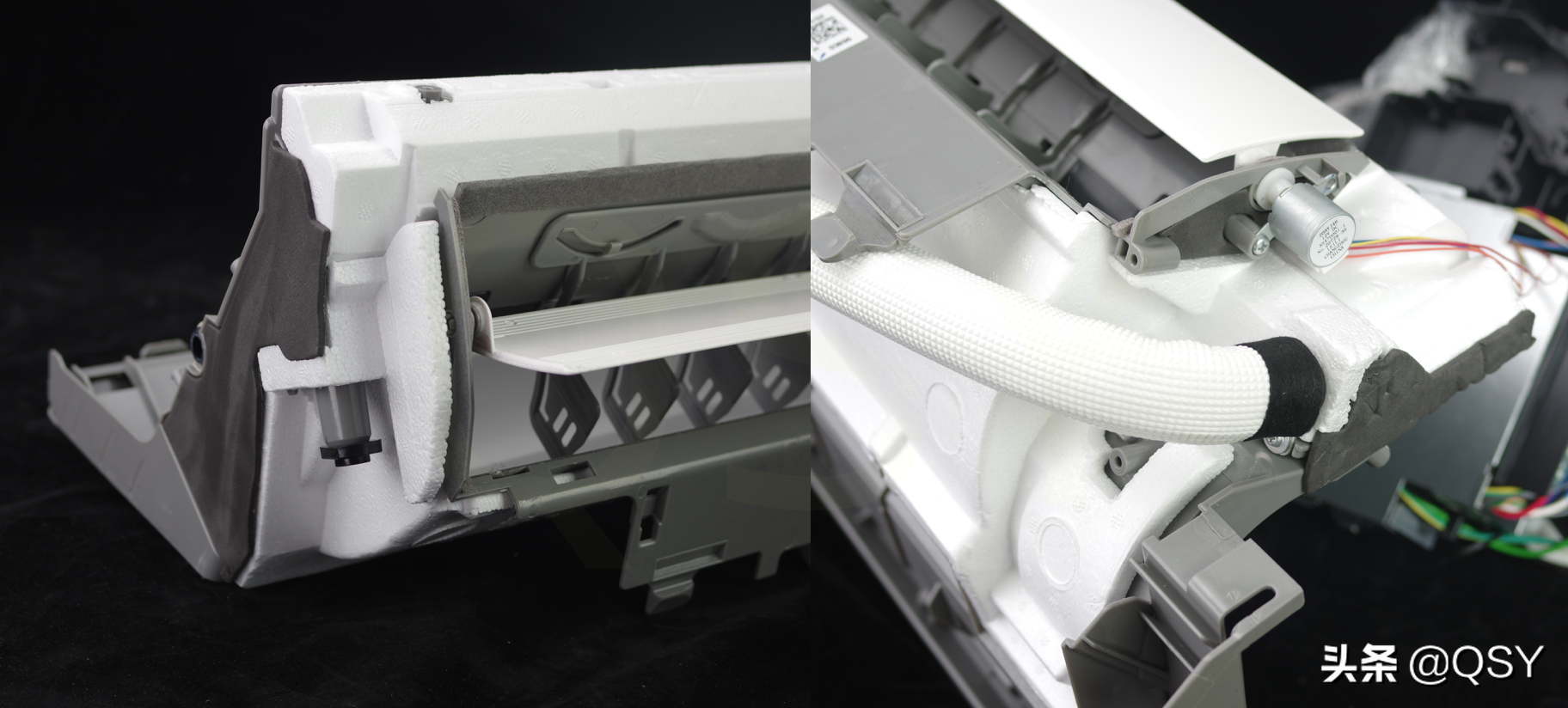 大金J系列使用泡沫框架,主要塑料部件之间都使用泡沫隔开,泡沫能隔音,有效避免热胀冷缩时,塑料部件的变形和拉扯,那种突然来一下噼里啪啦的声响。泡沫又能隔温,避免空调内机产生冷凝滴水,一般冷凝水都是部件隔温不好产生的。