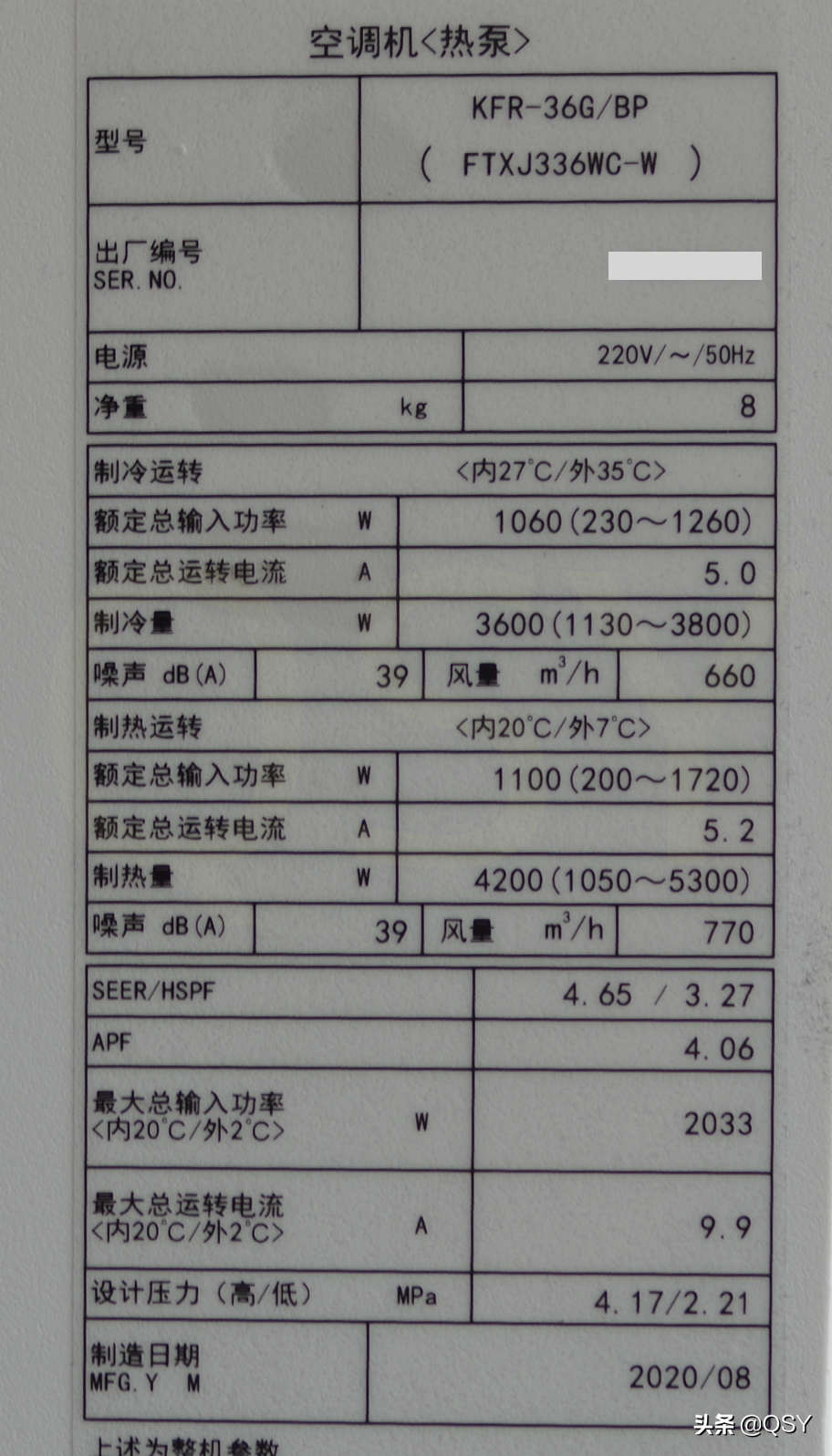 大金J系列,使用大金自家的“ODM磁悬浮式外转子电机”,遗憾的是电机上依然没参数,不知道电机功率。