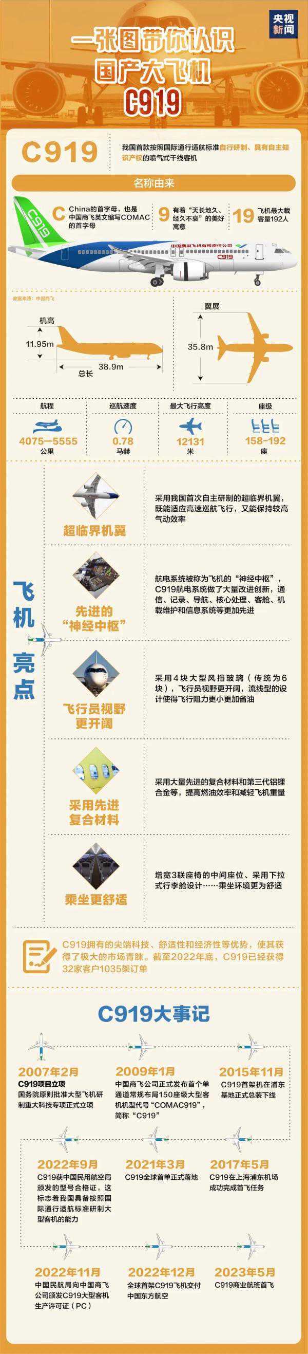 C919大型客机是我国首次按照国际通行适航标准自行研制、具有自主知识产权的喷气式干线客机,2007年立项,2017年首飞,2022年9月29日取得中国民航局型号合格证(TC证)。2022年12月9日,东航作为全球首发用户,正式从中国商飞接收编号为B-919A的全球首架交付飞机。