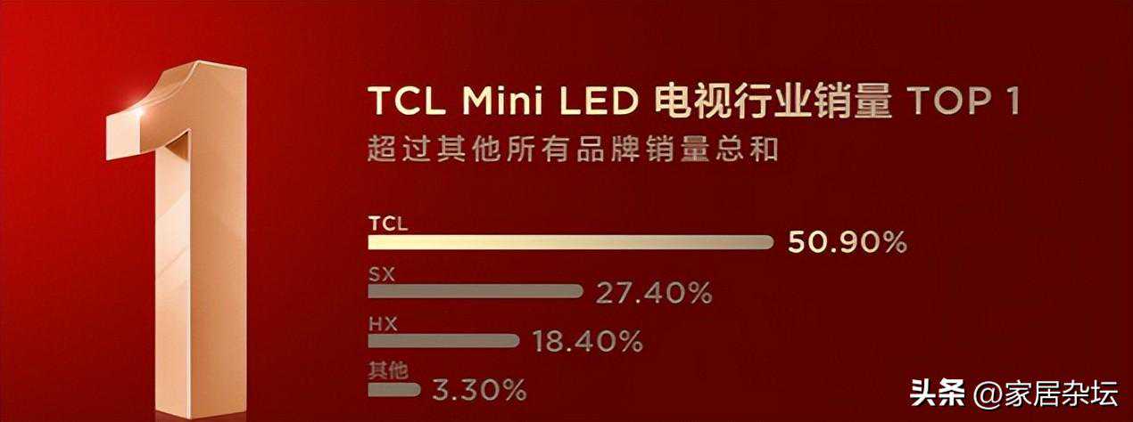 根据市场排名,TCL98吋电视在各类品牌累计市场份额中以50.9%占比霸占榜首第一名。