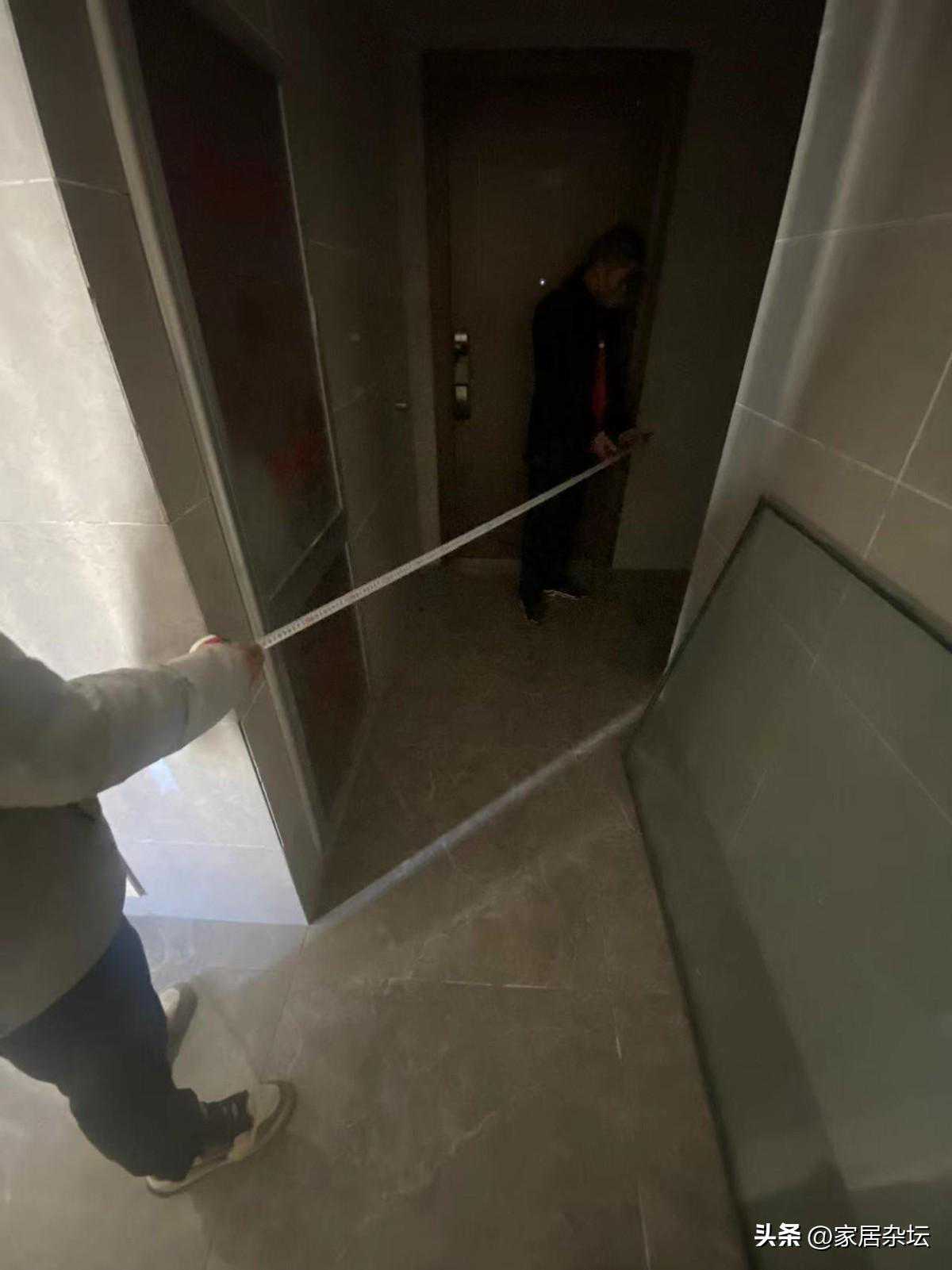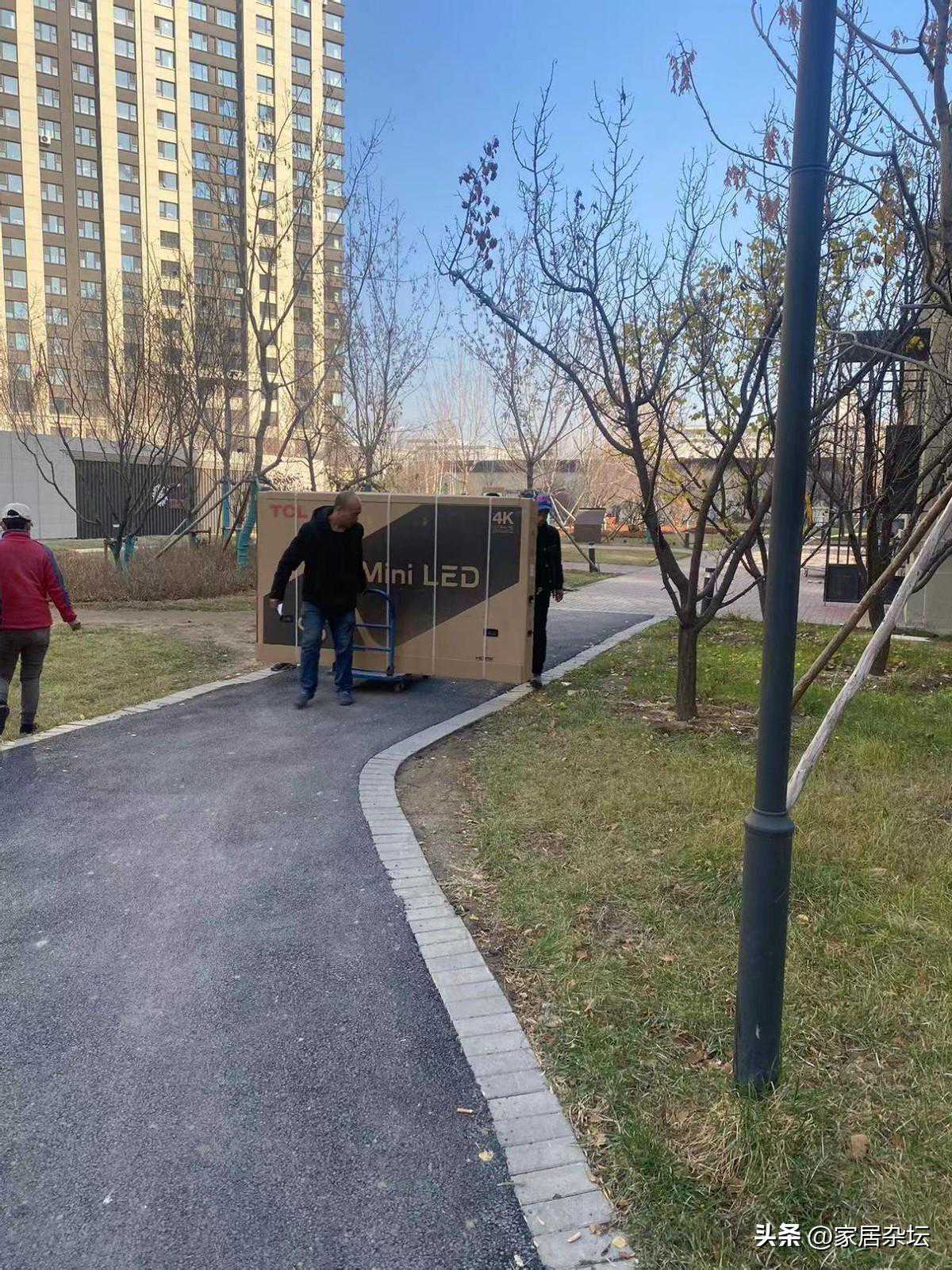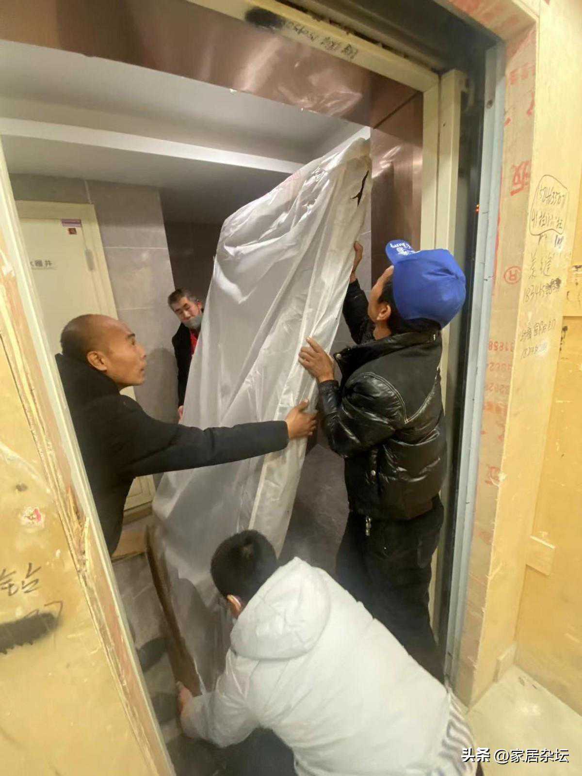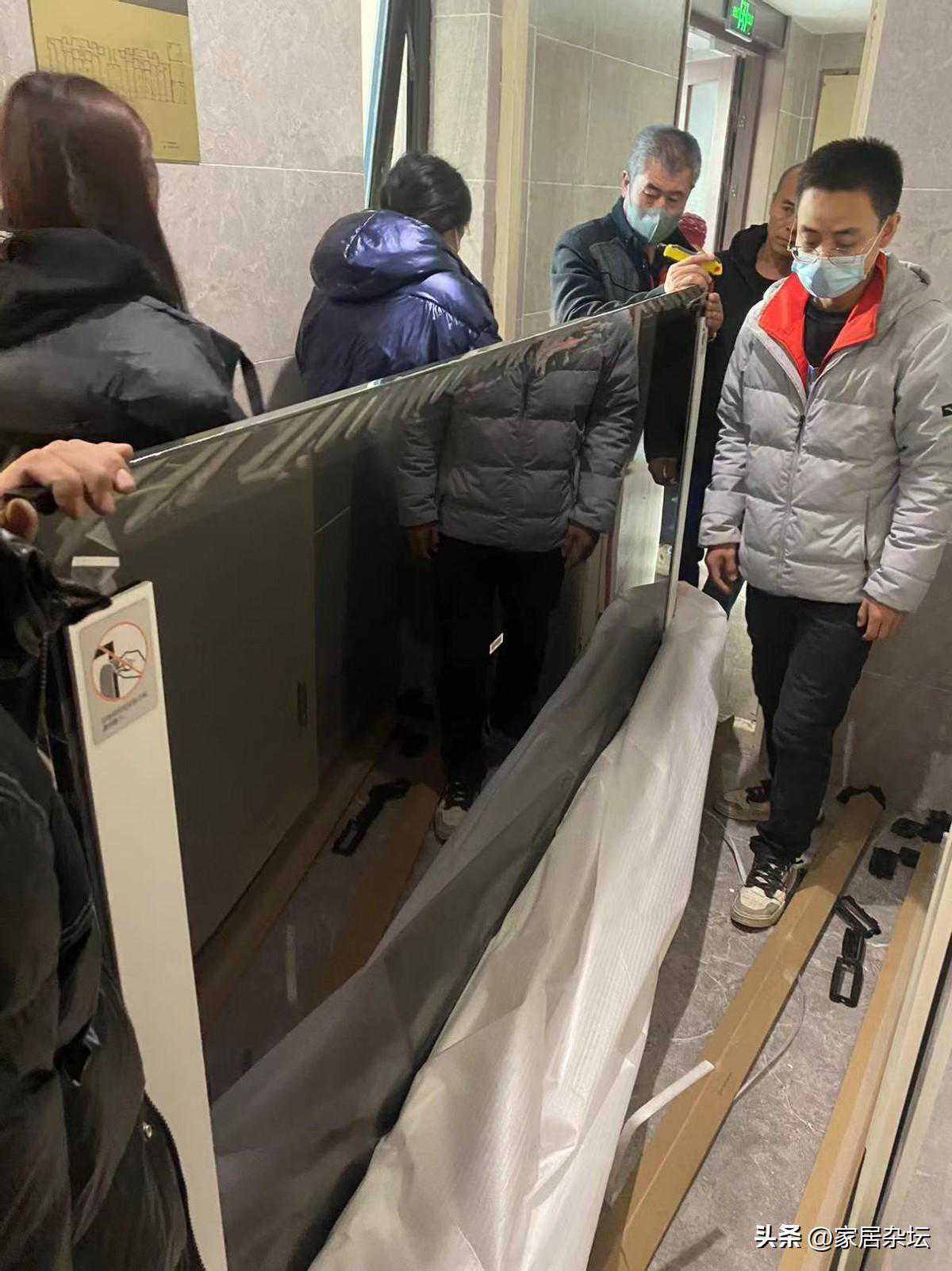 建议大家:在购买时,一定要量一下电梯的尺寸。我家的电梯尺寸是:长1210,宽2000,高2370,电视进入电梯,正正好好。如果电梯不符合的话,可能就需要采用吊机啦!