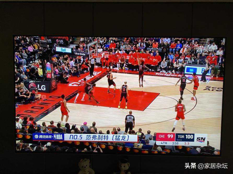 另外还有一点非常nice——音效。配合98Q10G自带的7单元2.1声道的安桥专业家庭影院音响,我在看NBA比赛的时候,从观众的欢呼声到球员的吼声乃至球鞋摩擦场地的脚步声,都非常清晰!明明电视就在人的正前方,但是会感觉声音全从四面八方涌进耳朵里,仿佛置身赛场之中,非常过瘾: