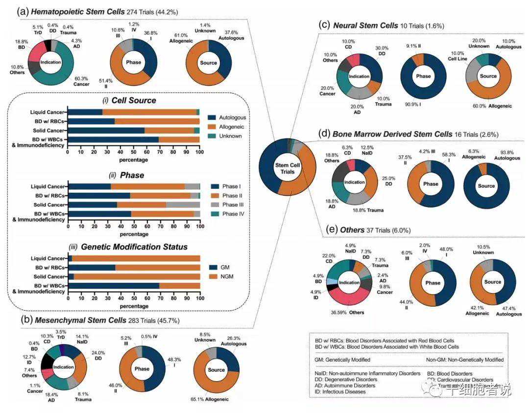620个干细胞临床试验,分类:a)造血干细胞;b)间充质干细胞;c)神经干细胞;d)骨髓干细胞;e)其他(心脏干细胞、角膜缘干细胞和内皮祖细胞)