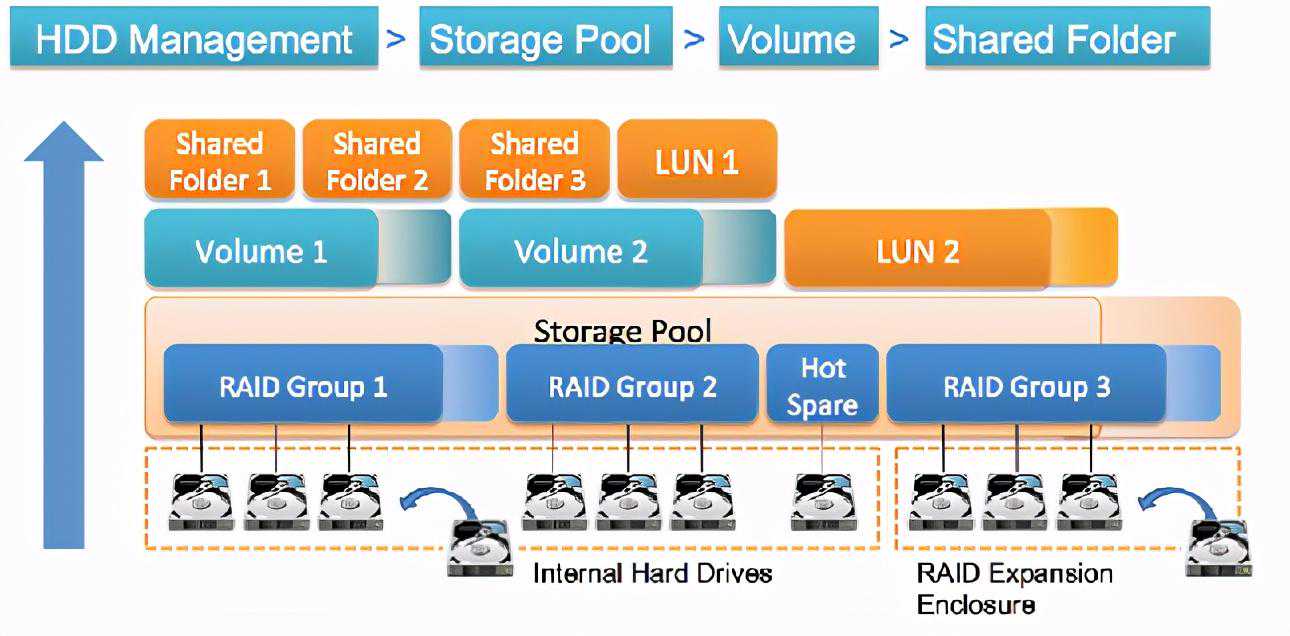 物理硬盘HDD/SSD构成存储池StoragePool,存储池之上划分卷Volume,卷上划分共享文件夹SharedFolder。