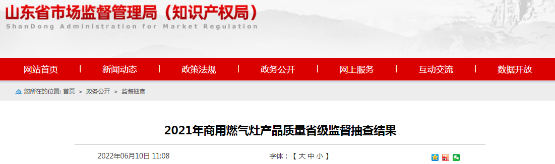 中2022年6月10日,山东省市场监督管理局网站发布2021年商用燃气灶产品质量省级监督抽查结果。2021年第4批省级监督抽查共抽查生产领域商用燃气灶产品31批次。