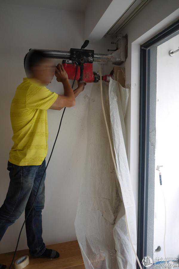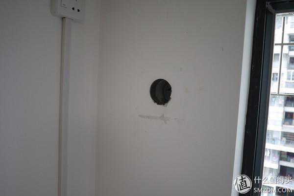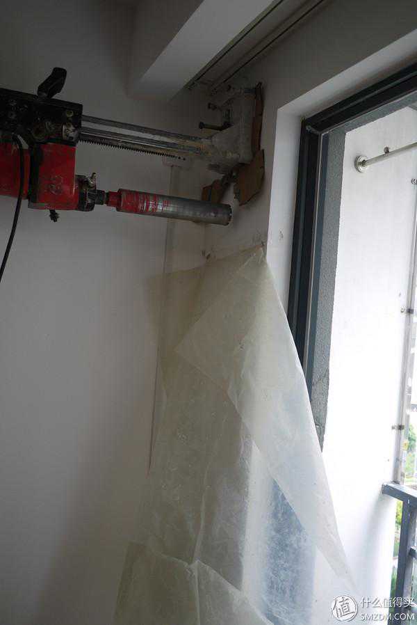 由于那面墙是混凝土的,所以必须用水钻,见过水钻打孔的人应该知道,打孔的时候污水横飞,还没刷墙的时候还好,等装修完毕再用水钻就很头大了。外墙面由于空间限制不能操作,所以只能在室内这一面操作,师傅看了下情况说:没事,只会影响孔周边的墙漆,其他地方不会弄坏弄脏的。这师傅看起来挺有经验的,不过现在也只能听他的了。Tips:空调孔的位置要低于内机,这样才能保证排水顺畅。