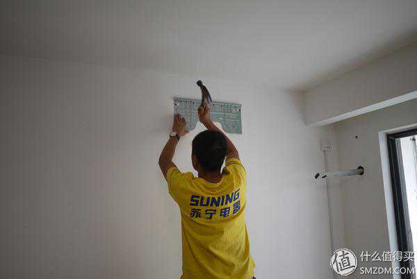 ▼内机安装板直接用钢钉打到墙内固定,钢钉至少要5颗,楼主让师傅打了7颗,非常牢固。最重要的一个步骤:一定要让师傅用水平尺确认水平,如果内机不是水平安装,可能会导致运行噪音,切记!