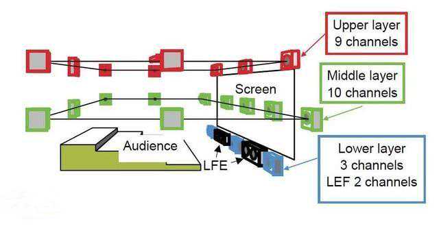 更重要的是,与8K分辨率相对应的是22.2声道标准,它已经把其他任何声道系统甩在身后,4K和1080p分辨率的5.1声道完全没有可比性。通过上层9声道、中层10声道、下层3声道三层配置的扬声器,以及双声道低频音効(LFE)扬声器,可极为细致地再现向前后左右及上下方向传播的声音。22.2声道的音响技术在与听众耳朵水平的位置、高于和低于听众耳朵的位置分别安放10个、9个和3个喇叭,另外配有由36个小低音单元组成的2个低音炮,其声音的逼真度细腻程度几乎达到了亲临现场地步。