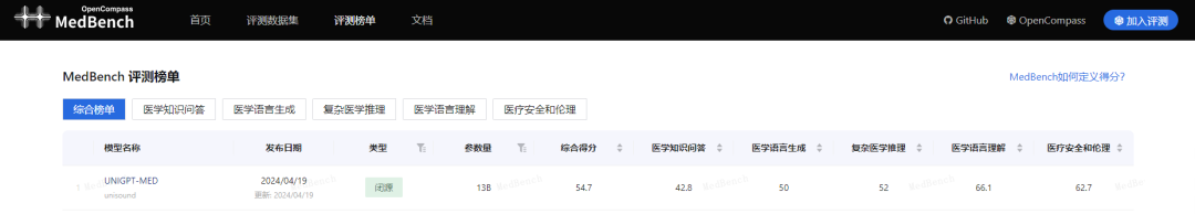 近日,上海AI实验室和上海市数字医学创新中心联合推出的MedBench评测更新榜单,云知声山海大模型医疗行业版(UNIGPT-MED)以综合得分54.7的优异成绩登顶榜首,充分彰显其硬核医疗实力。