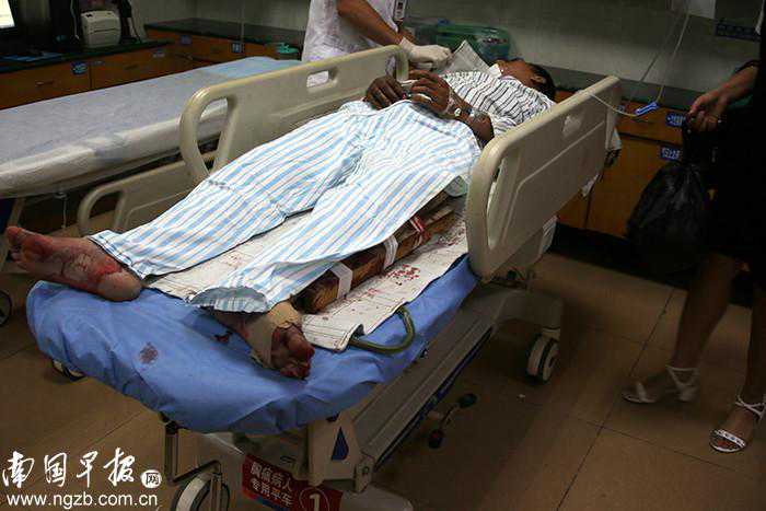伤者左脚伤势不轻,双手掌被炸得黑乎乎的。稍作处理后,伤者被送往南宁市第二人民医院急诊科施救。
