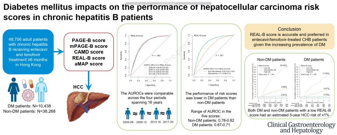 研究者自香港全港电子数据库筛选患者,纳入于2005年1月至2020年3月期间接受恩替卡韦或替诺福韦治疗≥6个月的CHB成人患者。据抗糖尿病药物使用、血红蛋白A1c≥6.5%、空腹血糖≥7mmol/L和(或)诊断代码,确定DM患者。使用时间依赖性受试者工作特征曲线下面积(AUROCs)评估PAGE-B、改良PAGE-B(mPAGE-B)和aMAP评分,并将这三种评分与以DM为组成部分的CAMD和REAL-B评分进行比较。