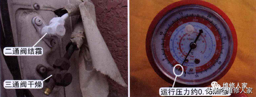 到室外机检査,见下图。目测二通阀结霜、三通阀干燥,在三通阀检修口接上压力表,系统运行压力仅为0.15MPa,说明系统缺少制冷剂。