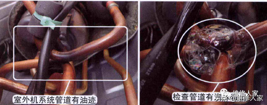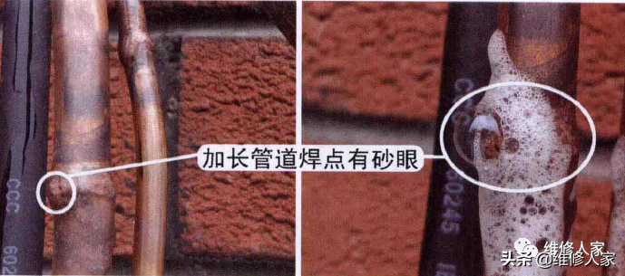 维修措施:放空制冷系统的氟,使用焊枪补焊压缩机回气管和四通阀连接管,再使用顶空法排除系统内空气,检査焊接部位无漏点,再次开机加氟至0.45MPa时制冷恢复正常,室外机二通阀和三通阀均结露。