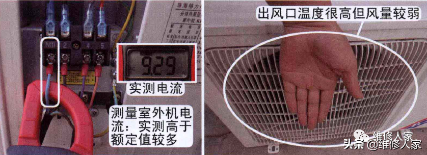 见下图,取下室外机接线盖,使用万用表电流挡测量接线端子1号N端电流,实测电流约9.3A,高于额定值5.5A较多。将手放在室外机出风口处,感觉温度很高但风量较弱。