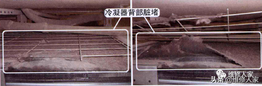 二通阀干燥、运行压力和电流均高于正常值、室外机出风口温度较高,说明冷凝器散热效果较差,常见原因有冷凝器脏堵或室外风机转速慢。观察室外机背部时发现冷凝器严重脏堵,已形成一层毛絮。
