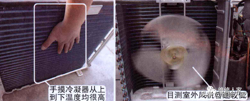 观察冷凝器背部干净,手摸冷凝器背部时从上到下温度均很高,而正常时为上部热、中部温、下部接近环境温度,说明冷凝器散热不好,冷凝器脏堵故障已排除,检査室外风机转速,目测较低。