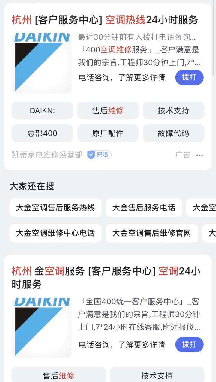 “我那天比较忙,人也不在杭州,就让吕先生联系官方售后来帮忙维修。”田总说,大金空调售出后的质保、维修等服务都是由全国售后部门统一安排的。而联系大金的售后维修部门一般通过在大众平台后台登记或者拨打官方的维修热线。“维修热线我记得不太清楚,只记得开头是400,末尾是1081。”为了确定维修热线,他通过一个搜索引擎上网找了一下,找到一个为“”的热线电话,而该热线电话的介绍网页上写着“大金空调”。