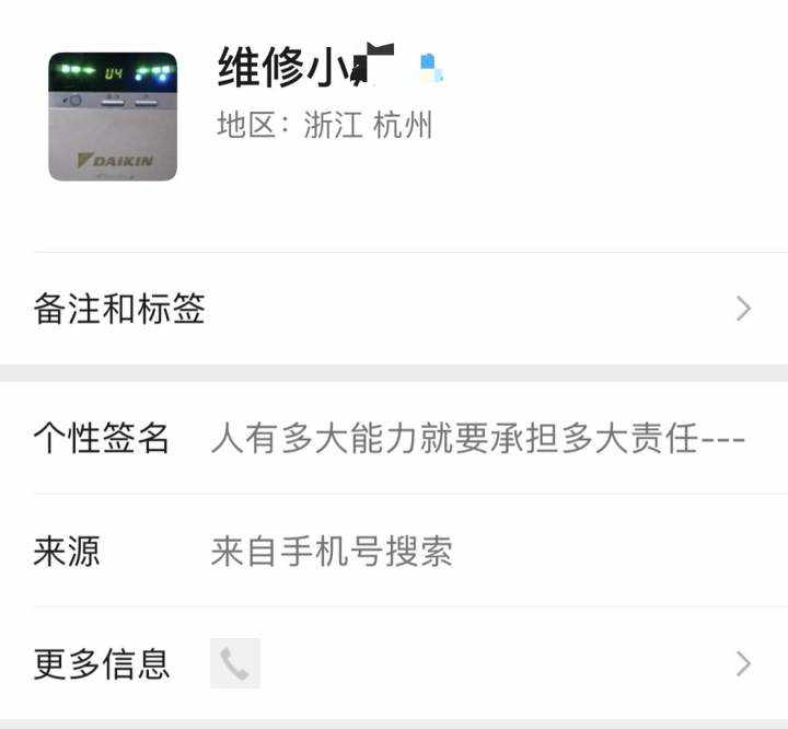 之后,记者也接到了不少自称是“大金空调”维修人员的电话。其中,一位维修师傅还加了记者的微信,头像还是使用了“大金空调”。