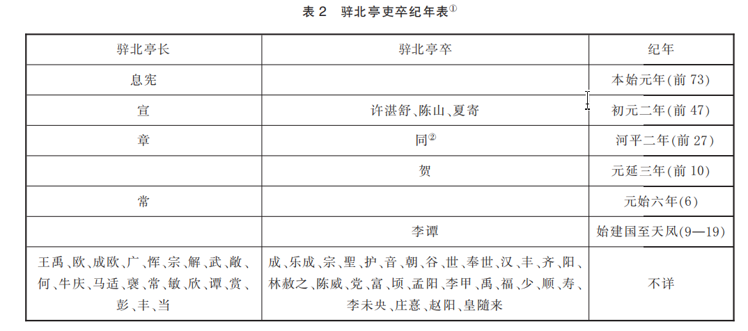 可见当时骍北亭卒至少有九人,及负责邮书传递又负责守望烽燧。骍北亭同时又为东部候长的驻地,殄北甲渠塞出土“檄到循行部界中,严教吏卒,惊烽火、明天田、谨迹候、候望,禁止往来行者,定烽火,辈送便兵战斗,具毋为虏所萃椠……(278.7B)”,吴昌廉论述“部”是塞上吏卒为便于巡行、捕亡、迹天田、禁兰越塞等,而区划之一守卫与警戒单位。郭伟涛统计出十九位东部候长,并考证出其中八位候长的存续时间,证明自宣帝地节三年(前67)至新莽天凤年间(14—19)东部塞的建置一直都存在。根据对带有“骍北亭”有时间纪年的简牍进行统计,可知骍北亭在金关的存续时间至少从汉宣帝五凤二年(前56)至汉平帝元始六年(6)。另外,关于骍北亭长、卒的统计,如下表2所示。