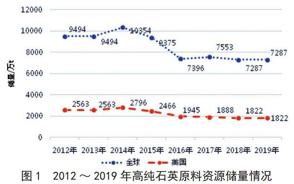 2014年以来,全球能够加工成SiO2含量≥99.9%高纯石英砂的资源量呈减少趋势,随着战略性新兴产业快速发展,其需求量持续增长,使全球高纯石英原料资源量持续减少。2014年全球能够加工成高纯石英原料资源储量10354万t,截止2019年底,减少至7287万t,减少率达到29.62%。