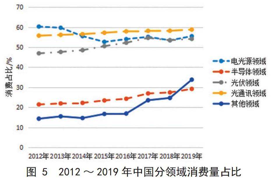 2019年随着新兴产业的快速发展,我国对高纯石英的消费结构有所变化,其中电光源领域消费占5.73%,半导体领域领域消费占50.49%,光伏领域消费占17.15%,光通讯领域消费占23.02%、其他领域消费占3.62%,半导体、光伏、光通讯、电光源等战略性新兴产业领域约占消费量的96.38%。