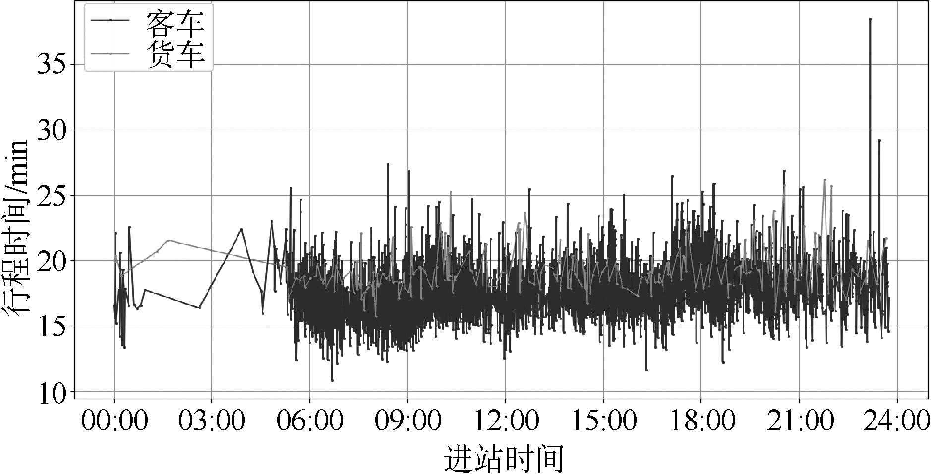 研究中通过设置合理时间区间进行筛选,对行程时间超出区间的收费记录予以剔除,此类共46条。合理时间区间设置方法如下。